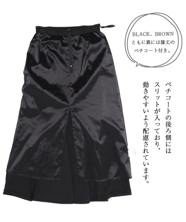 オンオフ活躍!きちんとシーンにも対応するマーメイドスカート シンプルながらも、バックスタイルを美しいマーメイドデザインにすることで上品なドレッシーさを演出。切り替えから下のフレアシルエットが歩くたびフワリと広がる女性らしいシルエット。 程よいハリととろみがバランスの良い生地で、立体感のあるシルエットをキープしつつ体型カバーも◎。マッドな質感と少しシャリっとする独特の手触りが魅力。幅広いシーンに対応できる上品な素材です。ブラック、ブラウンともに膝丈のペチコート付き。 |