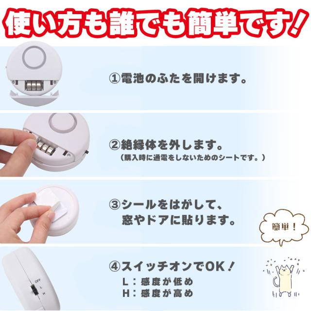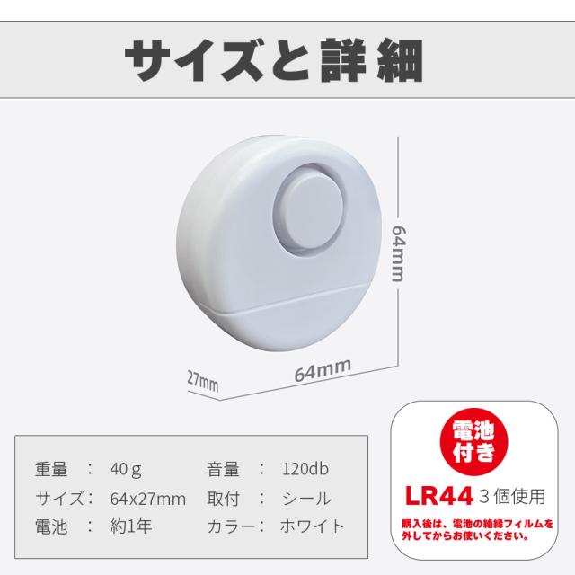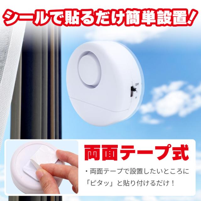 窓やドア等に貼り付けて、振動を感知すると120dbの大音量で30秒間アラームが鳴り響きます。感度も設定できるので、風で窓がよく揺れるところなどは感度低めに等、使い勝手が良いです。