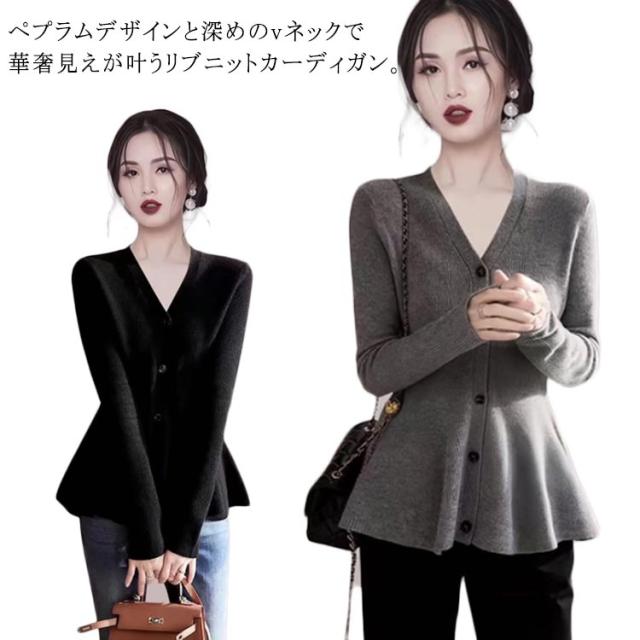 カーディガン リブニット ペプラム 長袖 ニットカーディガン カーディガン あったかい ニットトップス レディース Vネック 裾フレア 暖かい ニットカーデ 体型カバー エレガント フェミニン オフィス 通勤 通学