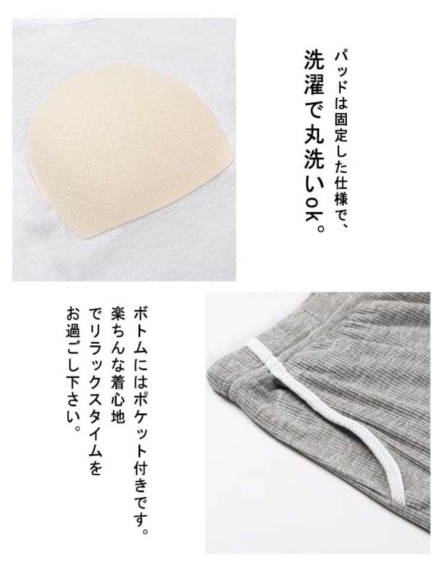 | ノーブラでもバストトップを気にならないカップ付きルームウェア。 サラリとした肌ざわりで、最高のリラックスを楽しめるパジャマ。 フェイクレイヤードやレース付きのファッションナブルなデザイン、パジャマには見えず、急な来客や宅急便対応やコンビニなどのちょっとしたお出かけでも使えるワンマイルウェア。 ボトムにはポケット付きです。楽ちんな着心地でリラックスタイムをお過ごし下さい。 パッドは固定した仕様で、洗濯で丸洗いok。 | |