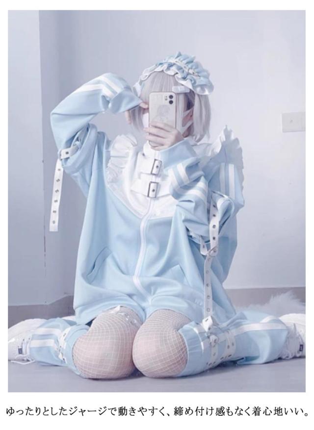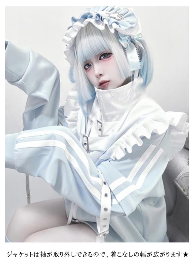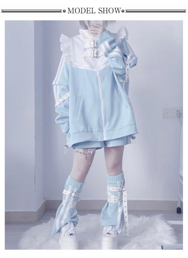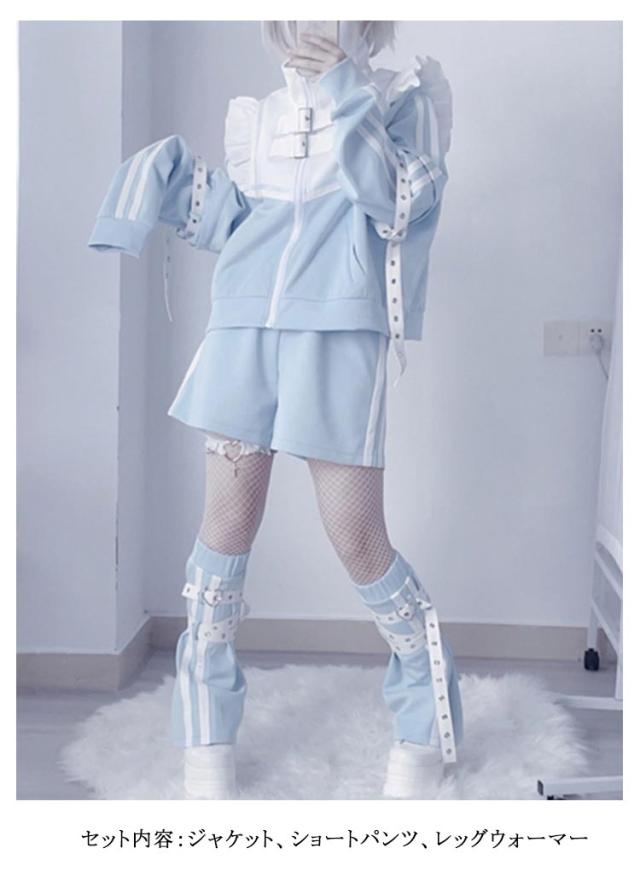 セットアップ 3点セット 水色 長袖 量産型 ジャケット サブカル ブルゾン ショートパンツ コート 地雷系 レディース ジュニア アイドル 女の子 レッグウォーマー 大人 女子 可愛い かわいい 原宿系 服 ジャージ 水色界隈
