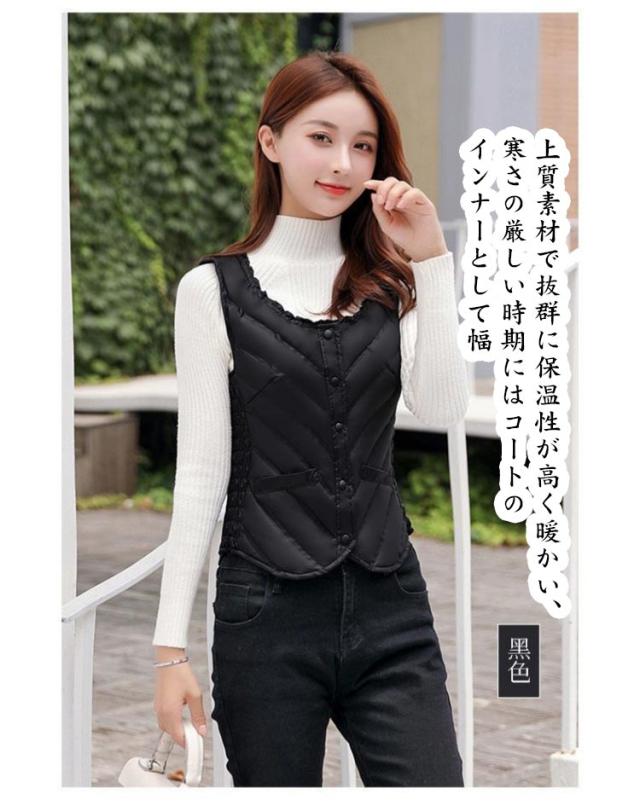 大きいサイズ フリル 無地 レディース 着膨れしない 保温 あったか ダウン風ベスト 秋冬 防寒 インナー 暖かい 中綿ベスト 軽い 可愛い スッキリ 軽い ウンドネック アウター トップス 羽織り ショート チョッキ 制服の下 インナーベスト 大人女性 通勤 ギフト