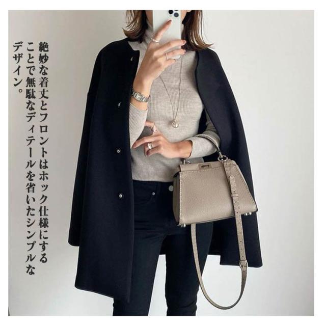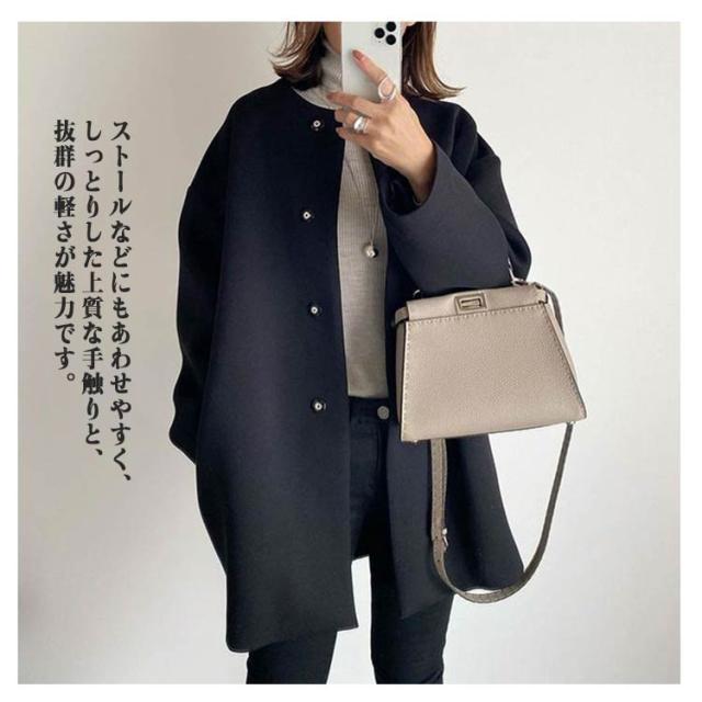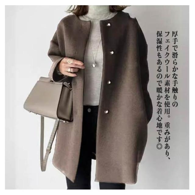 | スッキリとした顔まわりを演出できる人気のノーカラーコート。 厚手で滑らかな手触りのフェイクウール素材を使用。重みがあり、保湿性もあるので暖かな着心地です◎ ノーカラーデザインが顔周りをすっきりと見せてくれ、上品な雰囲気を醸し出してくれます。 ストールなどにもあわせやすく、しっとりした上質な手触りと、抜群の軽さが魅力です。 絶妙な着丈とフロントはホック仕様にすることで無駄なディテールを省いたシンプルなデザイン。 オンオフ問わず着回せる一枚に仕上げました。デート、クラブ、パーティー、結婚式様々なシーンで大活躍ですね♪ | |
