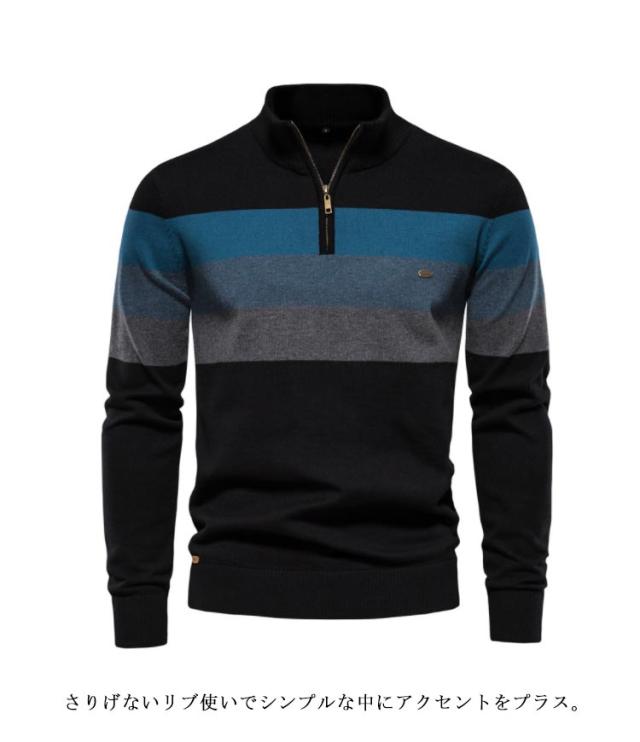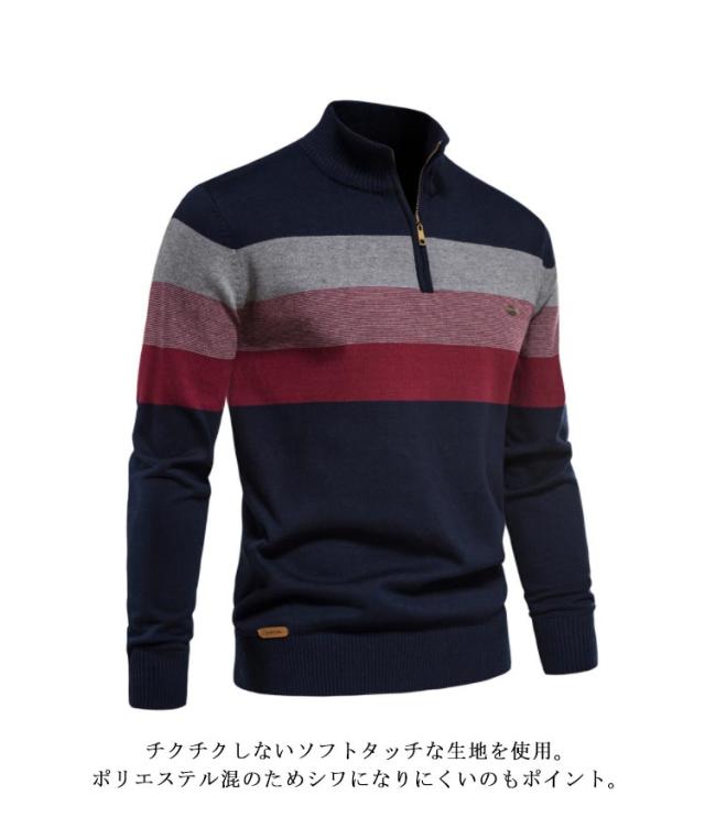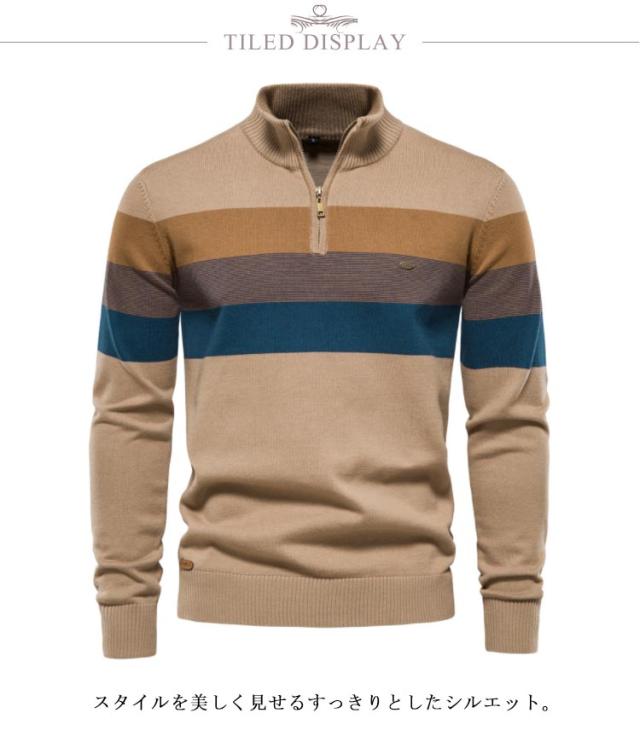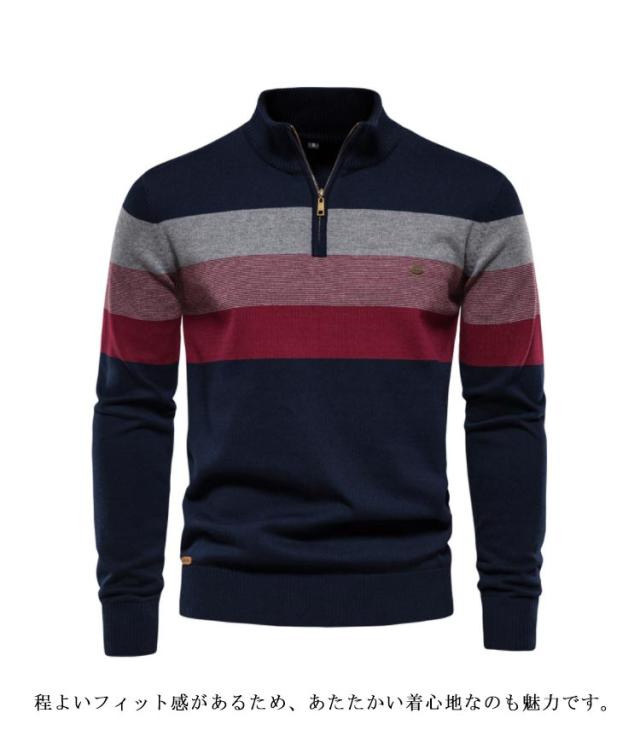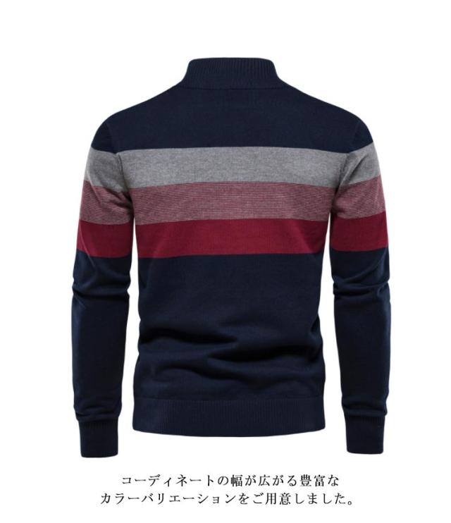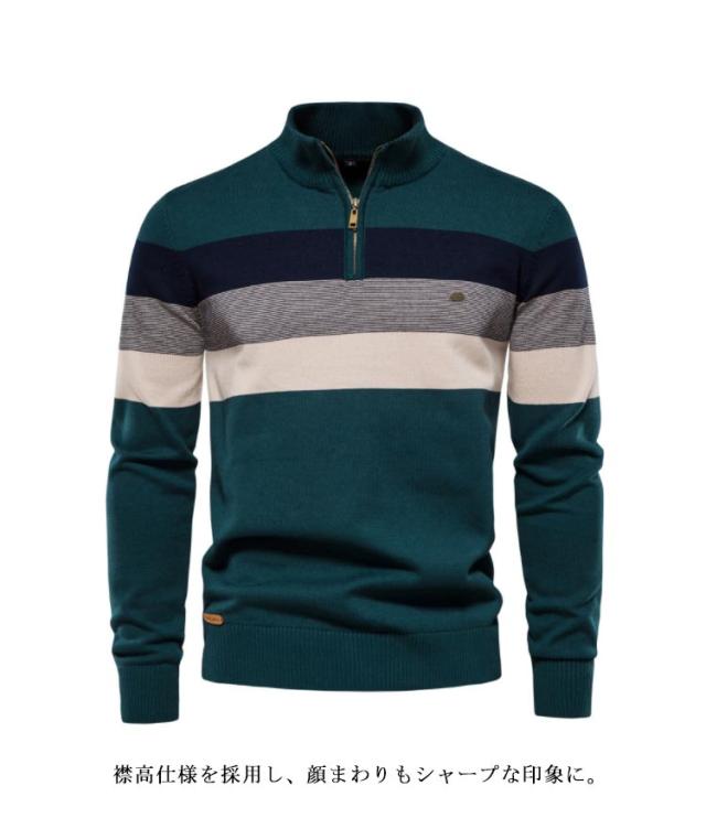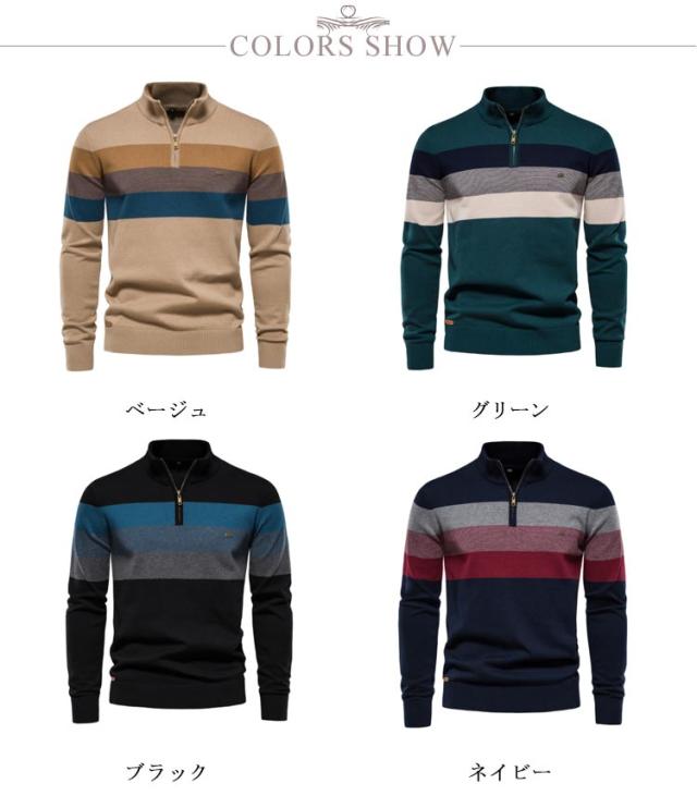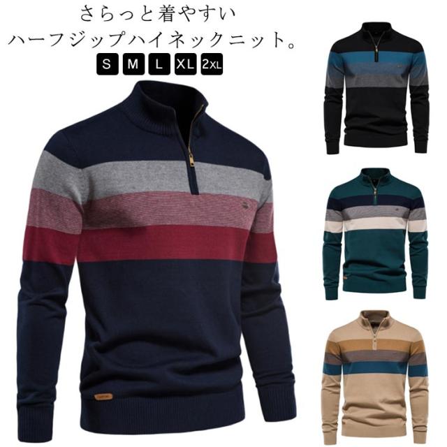 大きいサイズ ボーダー柄 メンズ ハーフジップ 立ち襟 セーター 秋冬 ニット ジッパー プルオーバー インナー ハイネックセーター ニットセーター ハーフジップニット カジュアル セーター セーター 送料無料 ベージュ グリーン ブラック