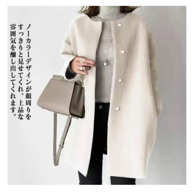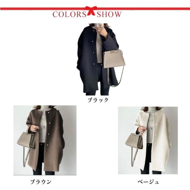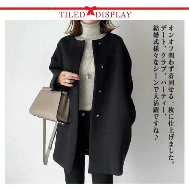 | スッキリとした顔まわりを演出できる人気のノーカラーコート。 厚手で滑らかな手触りのフェイクウール素材を使用。重みがあり、保湿性もあるので暖かな着心地です◎ ノーカラーデザインが顔周りをすっきりと見せてくれ、上品な雰囲気を醸し出してくれます。 ストールなどにもあわせやすく、しっとりした上質な手触りと、抜群の軽さが魅力です。 絶妙な着丈とフロントはホック仕様にすることで無駄なディテールを省いたシンプルなデザイン。 オンオフ問わず着回せる一枚に仕上げました。デート、クラブ、パーティー、結婚式様々なシーンで大活躍ですね♪ | |