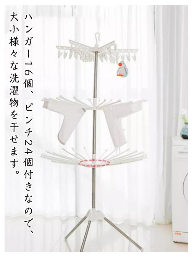 | サイズについての説明 | 展開サイズ:直径約80*高さ約170cm 上層:ハンガー4本、ピンチ24個 中層:ハンガー16本 下層:ハンガー16本 |
