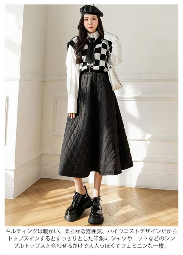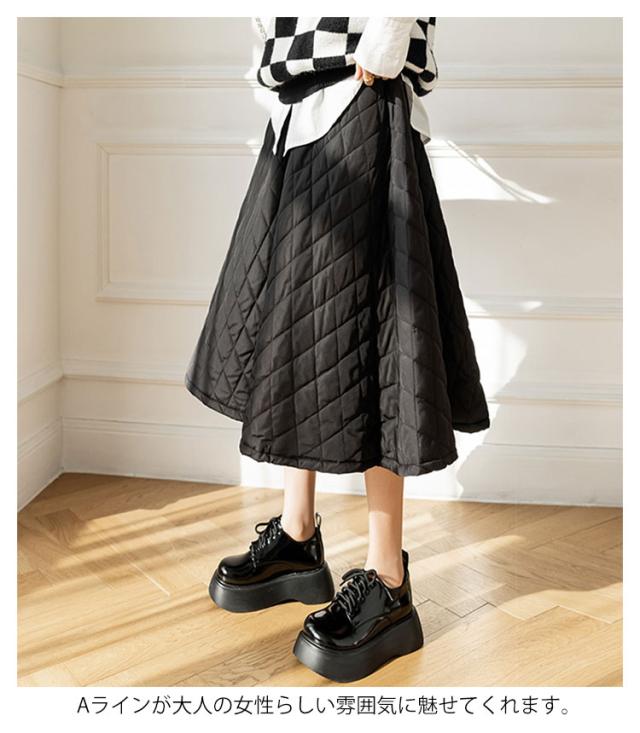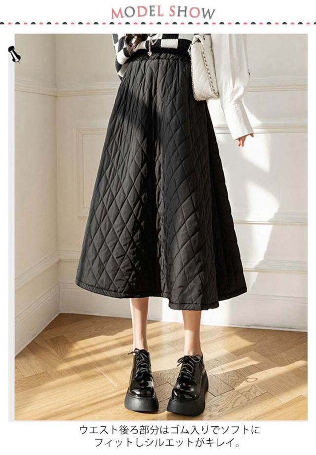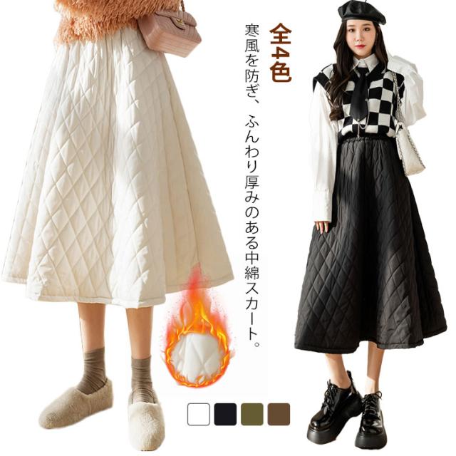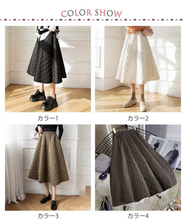 全4色 レディース ミモレ丈 フレア スカート 冬服 フレアスカート スカート 防寒 ロングスカート キルティング 膝下 ひざ下 Aライン キルティング 中綿スカート 全4色 リラックス 体型カバー 秋冬 暖かい ゆったり 大人 S M L