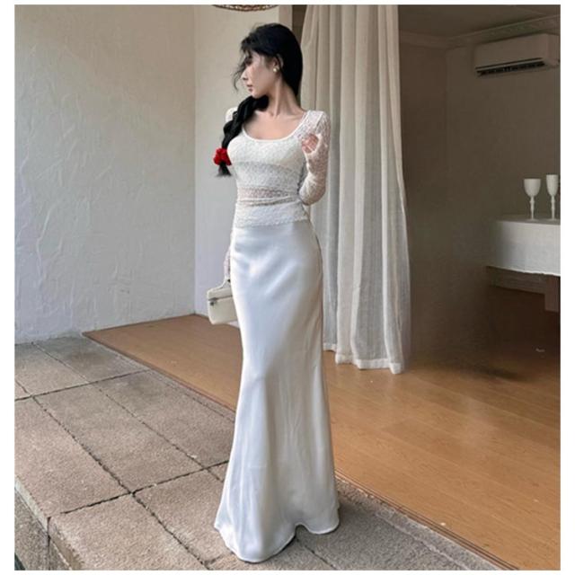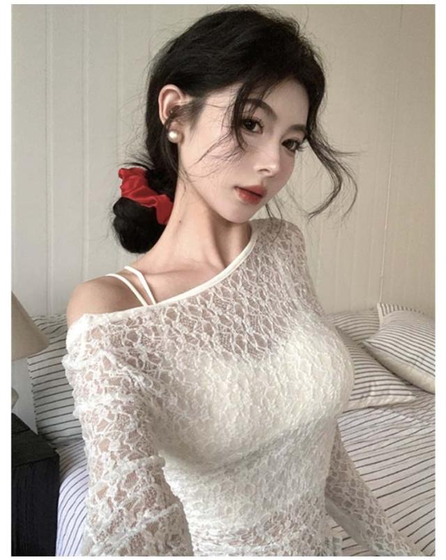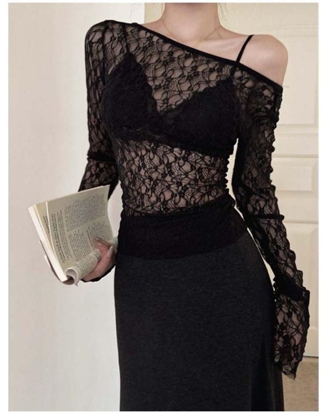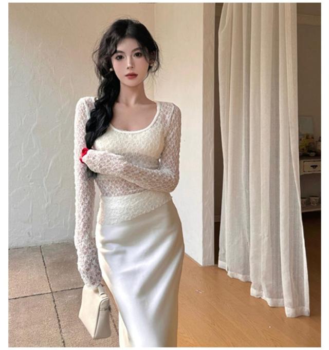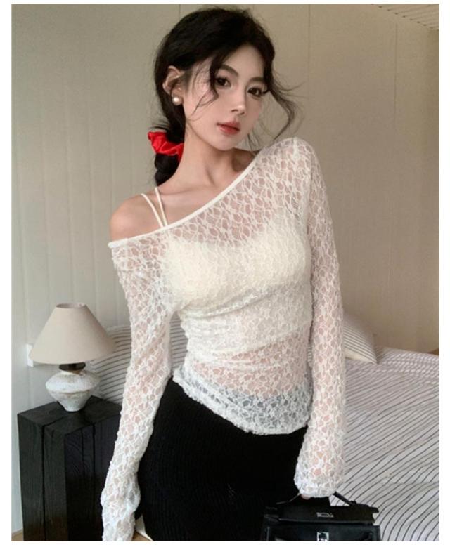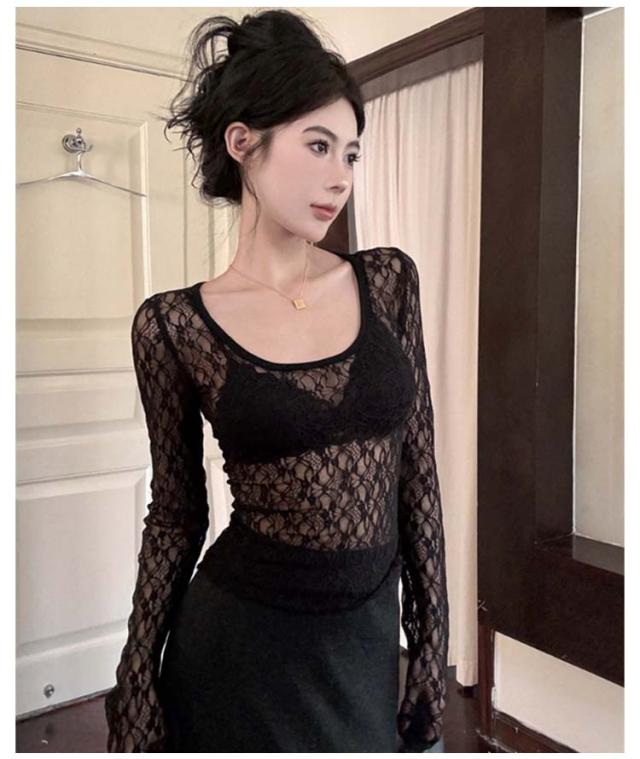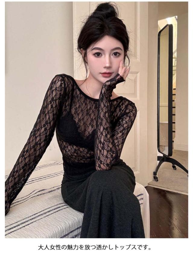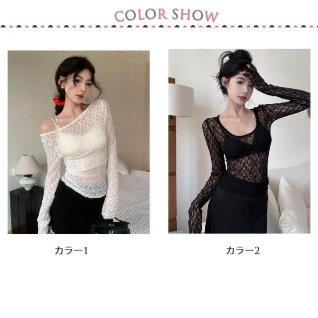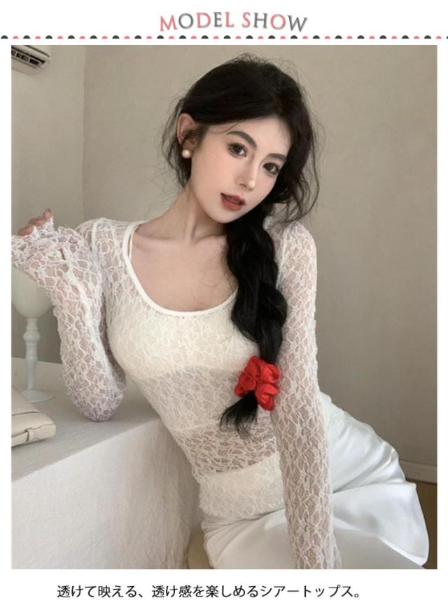 シースルー チュール Uネック レース レイヤード シアー 透け感 重ね 総レース カットソー ラウンドネック インナー 薄手 長袖 トップス シアートップス 総柄 シアーインナー 重ね着 長袖レース エレガント S M L