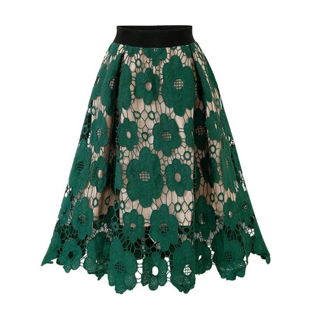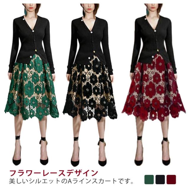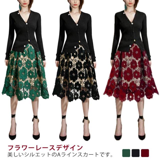 フラワーレース ハイウェストスカート フレア 透かし編み Aライン ロングスカート 大人 フラワーレース レーススカート 可愛い お呼ばれ エレガント フェミニン 大きいサイズ 体型カバー L XL 2XL 3XL 4XL
