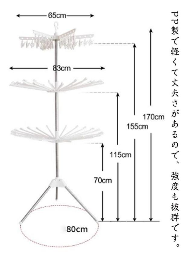 | サイズについての説明 | 展開サイズ:直径約80*高さ約170cm 上層:ハンガー4本、ピンチ24個 中層:ハンガー16本 下層:ハンガー16本 |