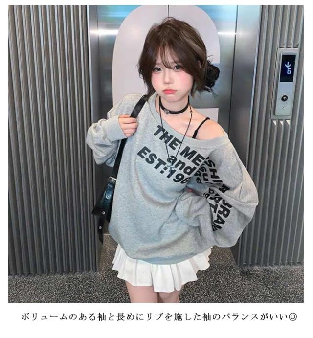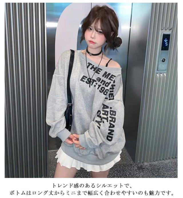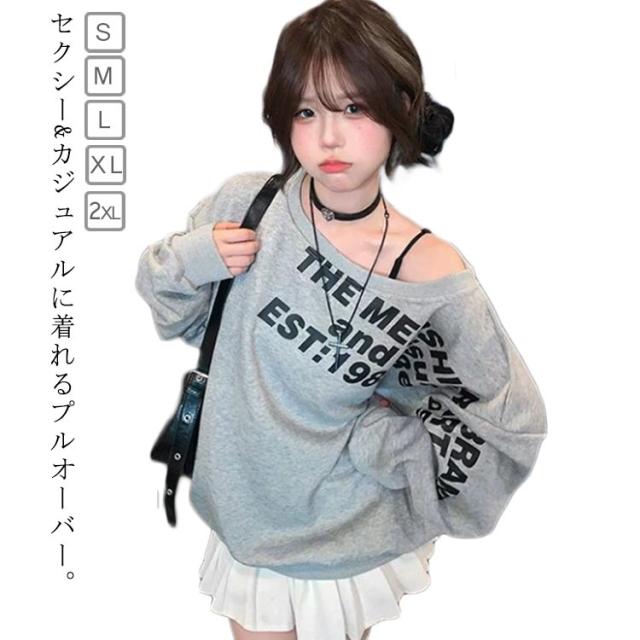 韓国 トレーナー 薄手 オフショルダー 秋 肩見せ 長袖 ビックシルエット レディース ゆったり プリント ロゴ トップス 長め ロング 春 オーバーサイズ 冬 スウェット ストリート おしゃれ スウェット グレー プルオーバー 送料無料
