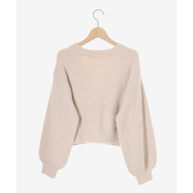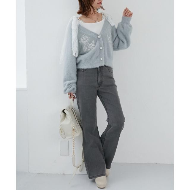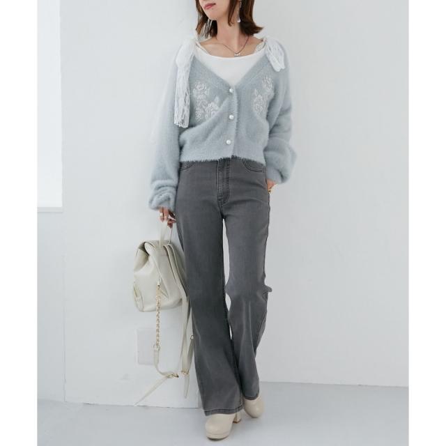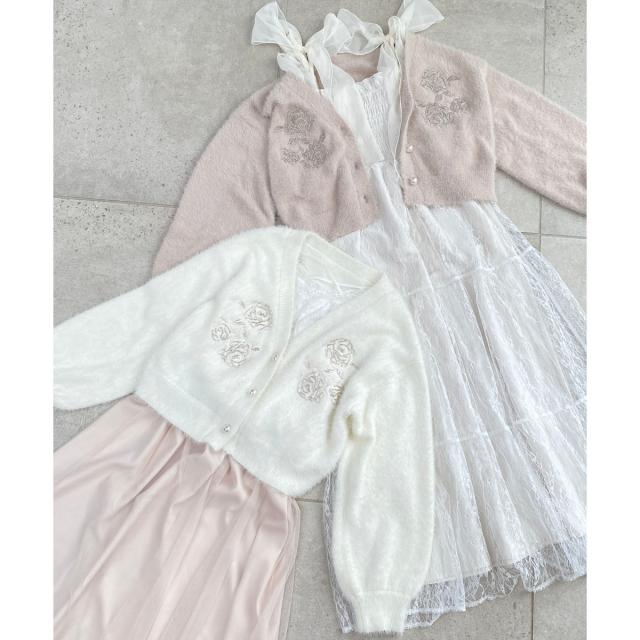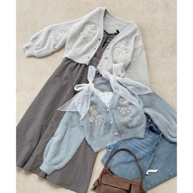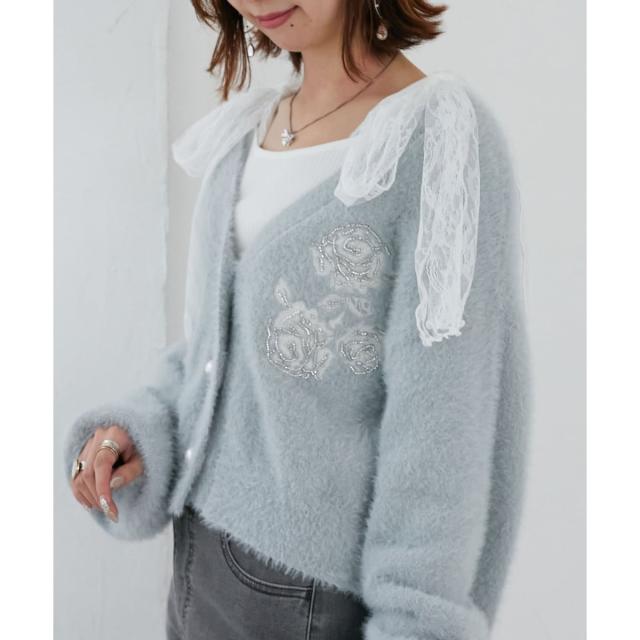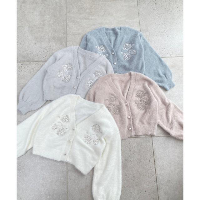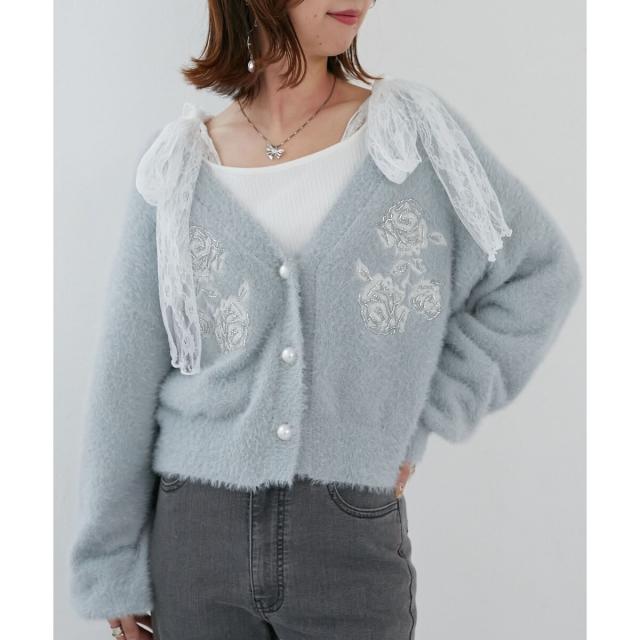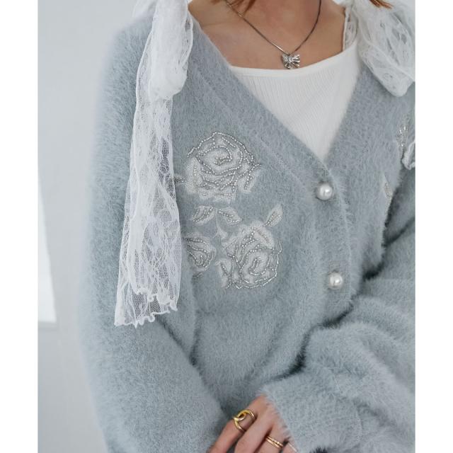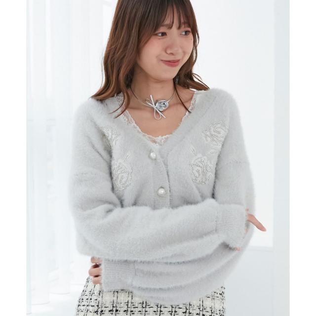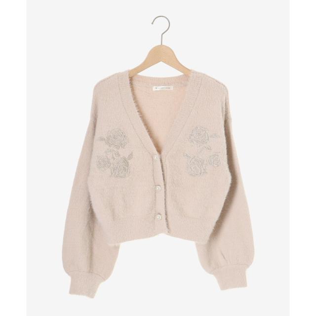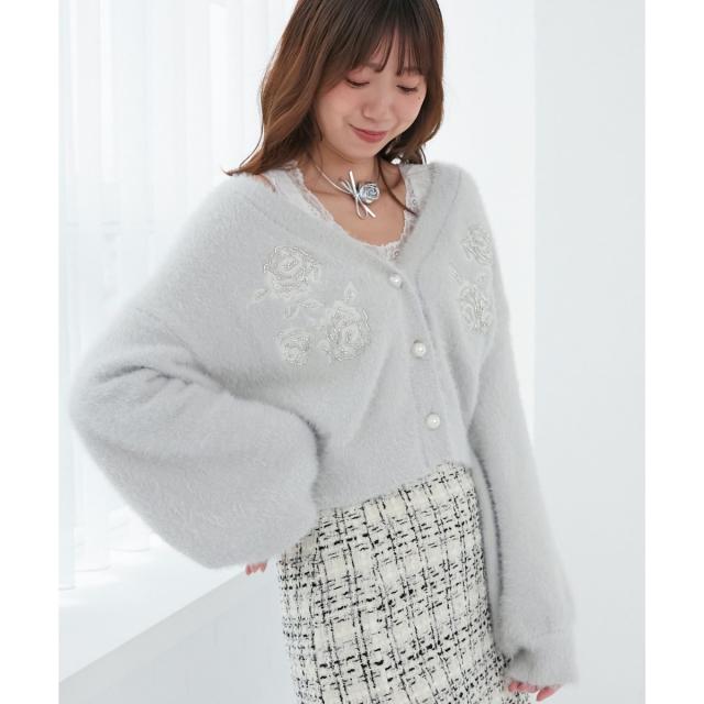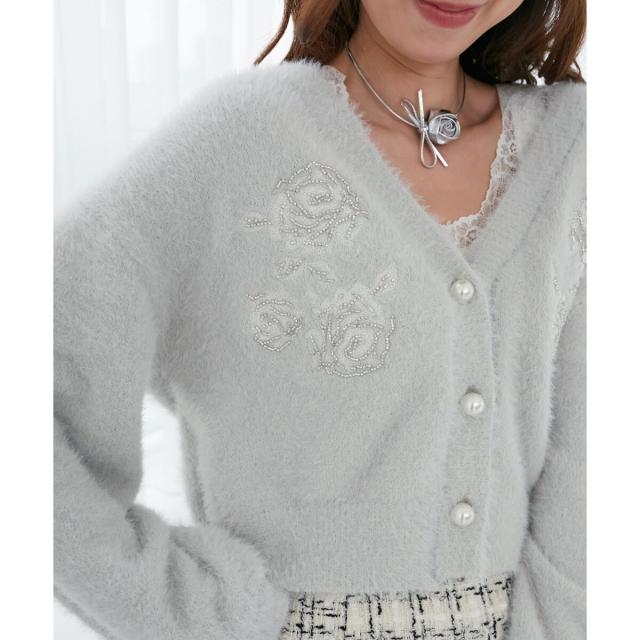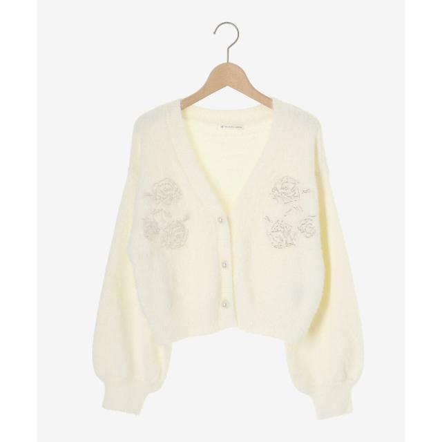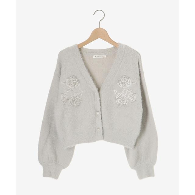 ふわふわのシャギーにフラワーモチーフの刺繍とビーズを施した、華やかにシーズンムードを高めてくれるカーディガン。