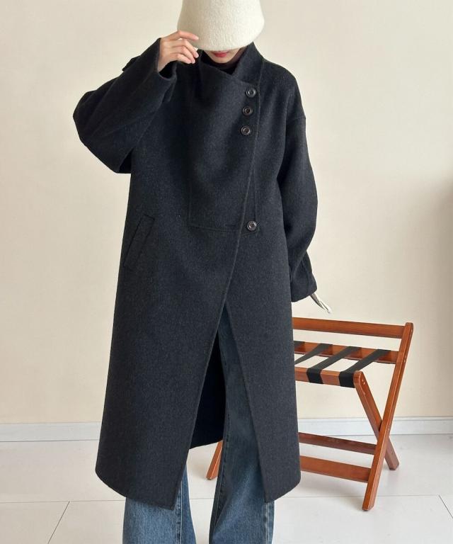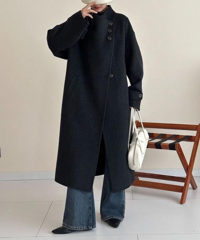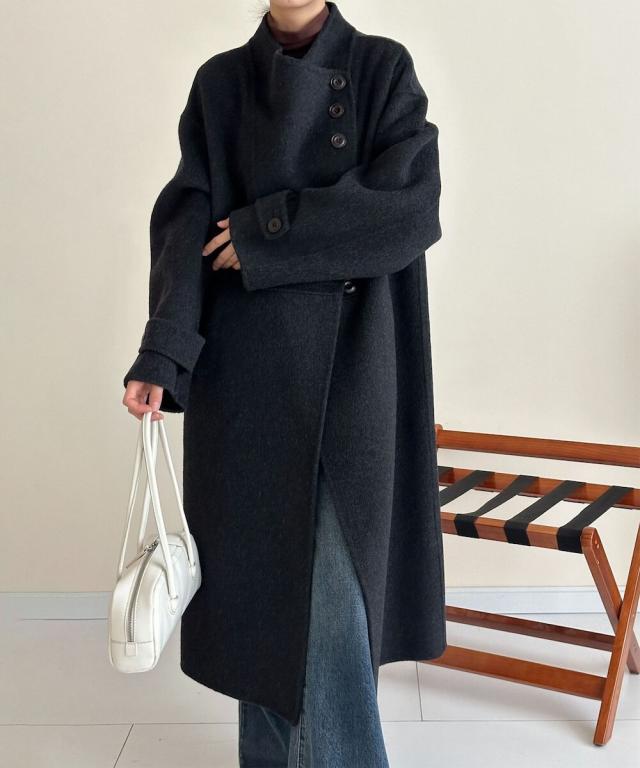 アシンメトリーが特徴のウールロングコート。高品質なウール素材を使用しており、柔らかく暖かい着心地。シンプルなデザインに映える前面のボタン配置が個性的で、クラシックさの中にモダンなエッセンスを加えたデザインが魅力です。