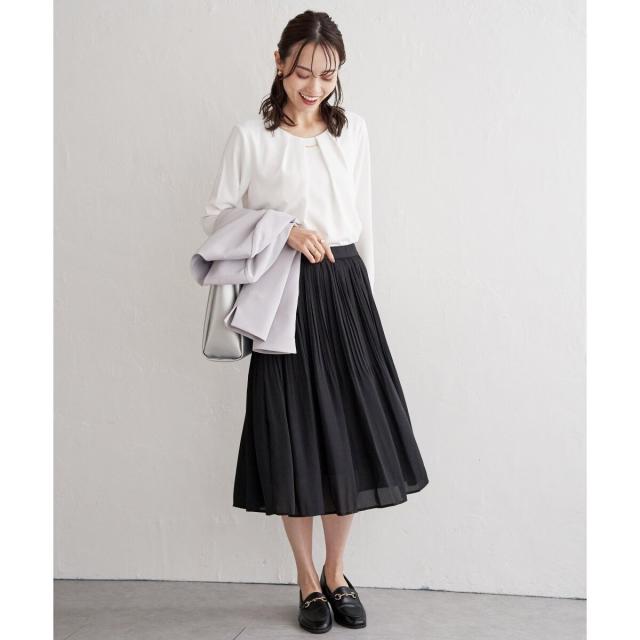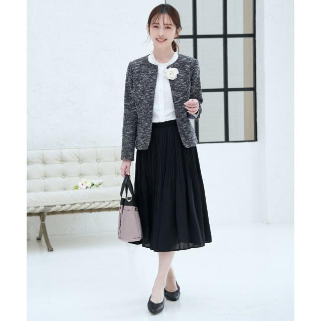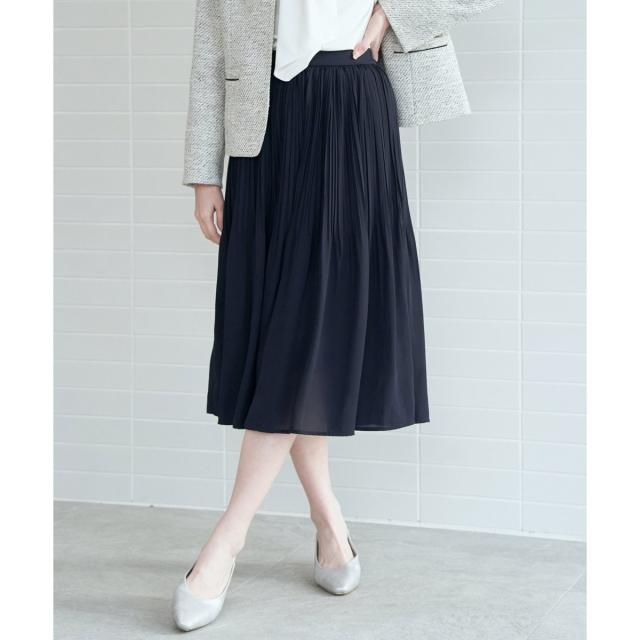 女性らしい細かめのプリーツがかかった、セレモニースタイルにピッタリなひざ下丈スカート。
