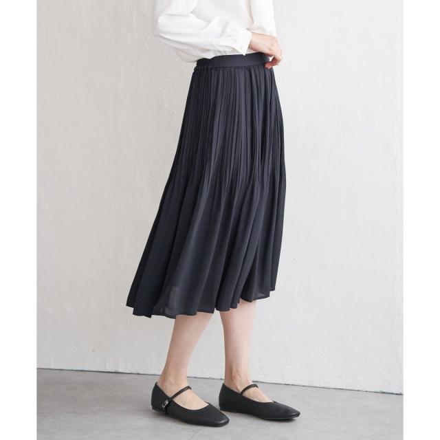 ひざ下レングスで足元をきれいに見せるシフォンプリーツスカート。