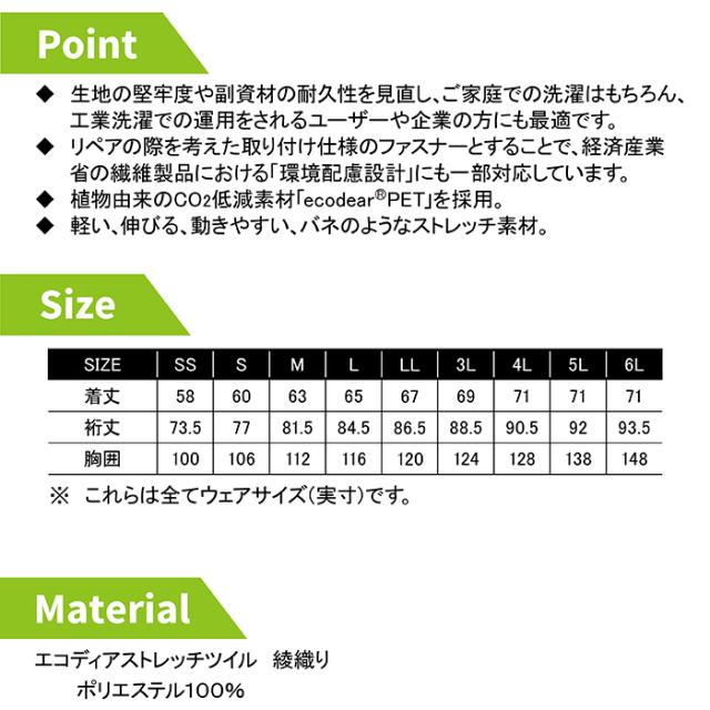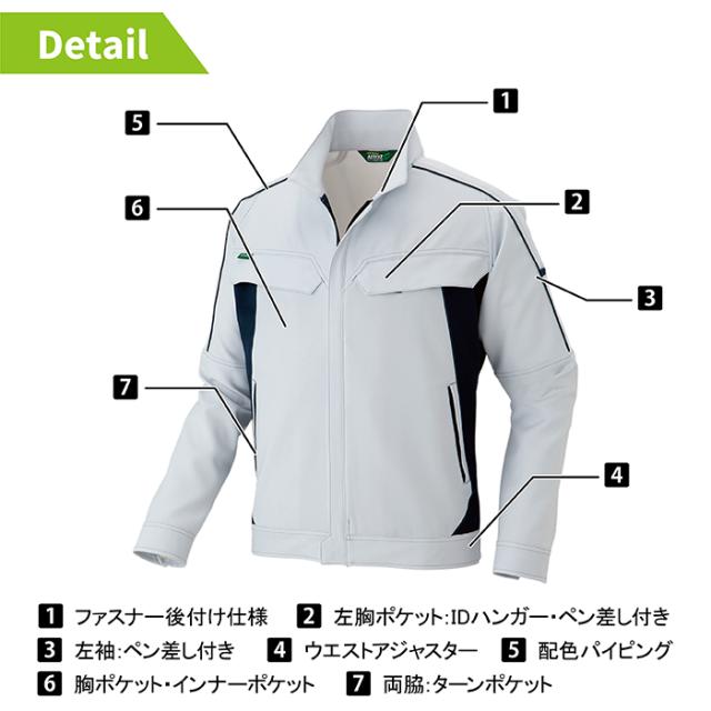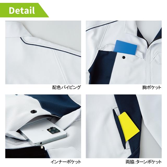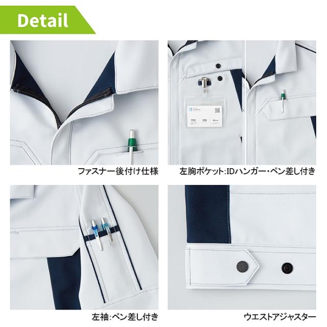 ◇機能:ファスナー後付け仕様・胸ポケット・胸インナーポケット・袖ペン差し・IDハンガー・胸ペン差し・配色パイピング・ターンポケット・ウエストアジャスター・JIST8118適合帯電防止