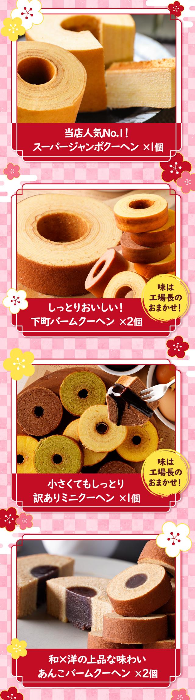 スーパージャンボクーヘン×1、下町バームクーヘン×2、ミニクーヘン×1、あんこバームクーヘン×2、クリームサンド×1、フルーツあんこバームクーヘン×1、スティッククーヘン×1
