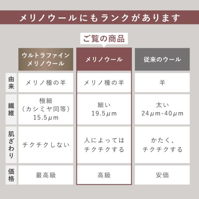 ※人によっては、チクチク感じる場合がありますので、非常に敏感肌の方は、ワンランク上のメリノウール「ウルトラファインメリノウール」をお選びください。