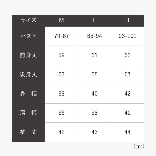 ■サイズ:M/バスト79-87、前身丈59、後身丈63、身幅38、肩幅36、袖丈42、L/バスト86-94、前身丈61、後身丈65、身幅40、肩幅38、袖丈43、LL/バスト93-101cm、前身丈63、後身丈67、身幅42、肩幅40、袖丈44cm