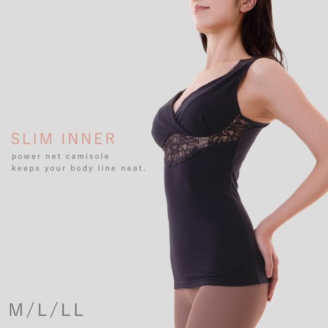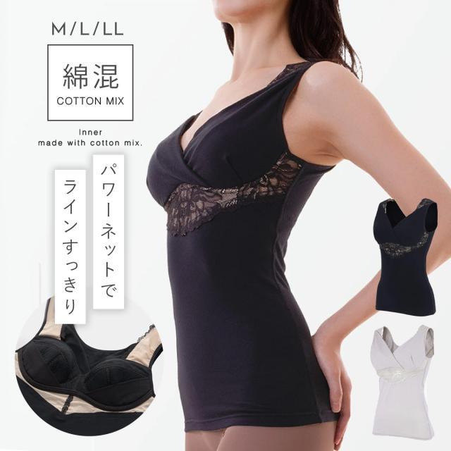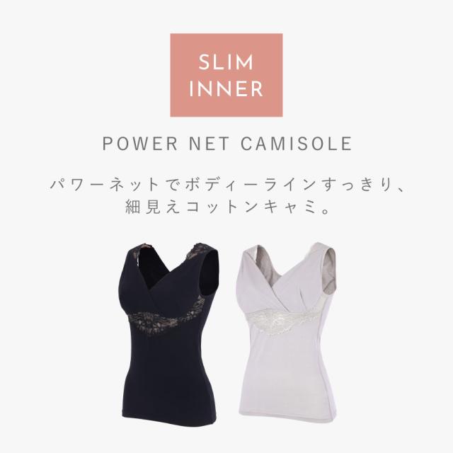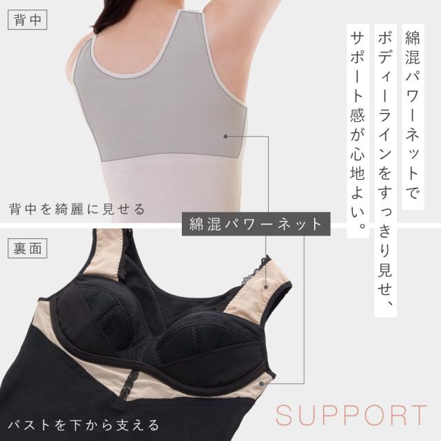 綿混パワーネットでボディーラインすっきり、細見えコットンキャミ。肌面の肩と背中上部、アンダーバストに、伸縮性のある綿混のパワーネット付き。