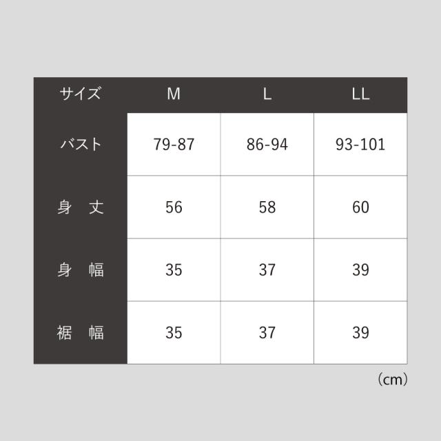 ■サイズ:M/バスト79-87、身丈56、身幅35、裾幅35、L/バスト86-94、身丈58、身幅37、裾幅37、LL/バスト93-101cm、身丈60、身幅39、裾幅39cm