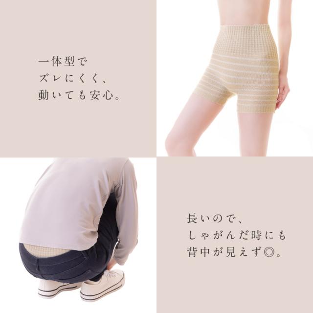 一体型でズレにくく、動いても腹巻き部分が上がったり、パンツが下がったりする心配なし。