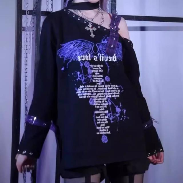 Tシャツ レディース ルーズ カットソー トップス 長袖 肩出し ワンショルダー ベルト シャツ かわいい pLegLad店 個性的 y2k 学生 ゴシック V系 地雷系 ブラック 春秋 韓国スタイル 20代 10代