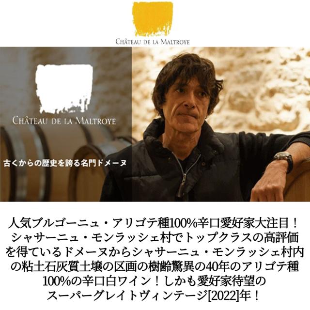 人気ブルゴーニュ・アリゴテ種100%辛口愛好家大注目!シャサーニュ・モンラッシェ村でトップクラスの高評価を得ているドメーヌからシャサーニュ・モンラッシェ村内の粘土石灰質土壌の区画の樹齢驚異の40年のアリゴテ種100%の辛口白ワイン!しかも愛好家待望のスーパーグレイトヴィンテージ[2022]年!