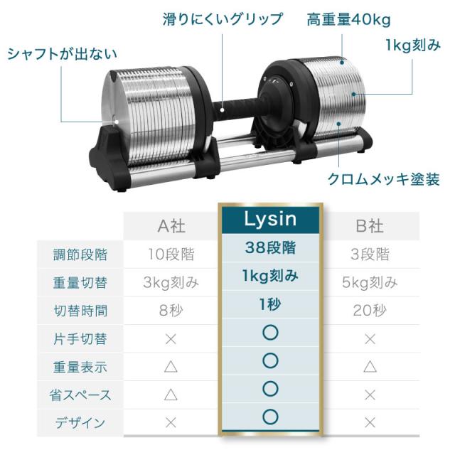 【仕様】 メタル クロムメッキ プレート 面取り加工 高重量 高精度 精密 1kg重量切替 可変式ダンベル 38段階 重量 調節可能 アジャスタブル 省スペース