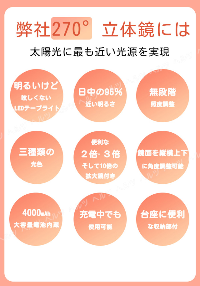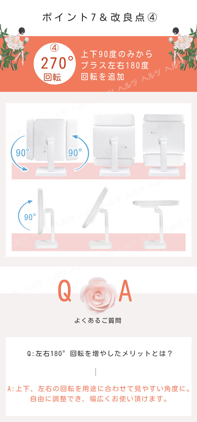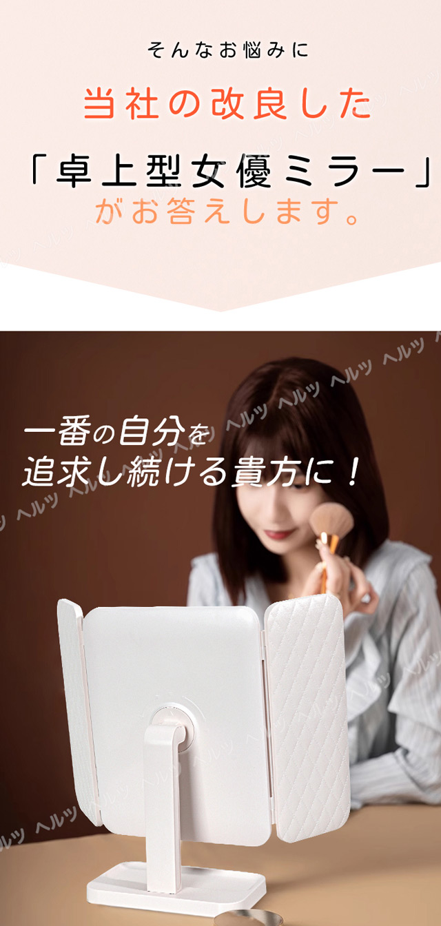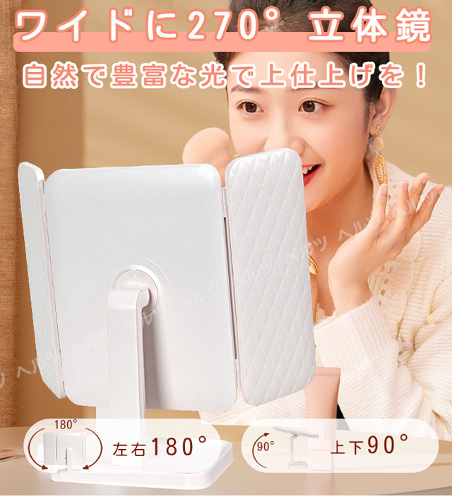 2倍や3倍拡大鏡と普通鏡が合わせて設計された折り畳み式三面化粧鏡です。三面鏡だからお顔全体や横顔もしっかり映ります。正面だけでなく、普段見づらい斜め、横顔もチェックできます。また、鏡本体は270度傾けることが可能ですので、快適な角度でメイクできます。