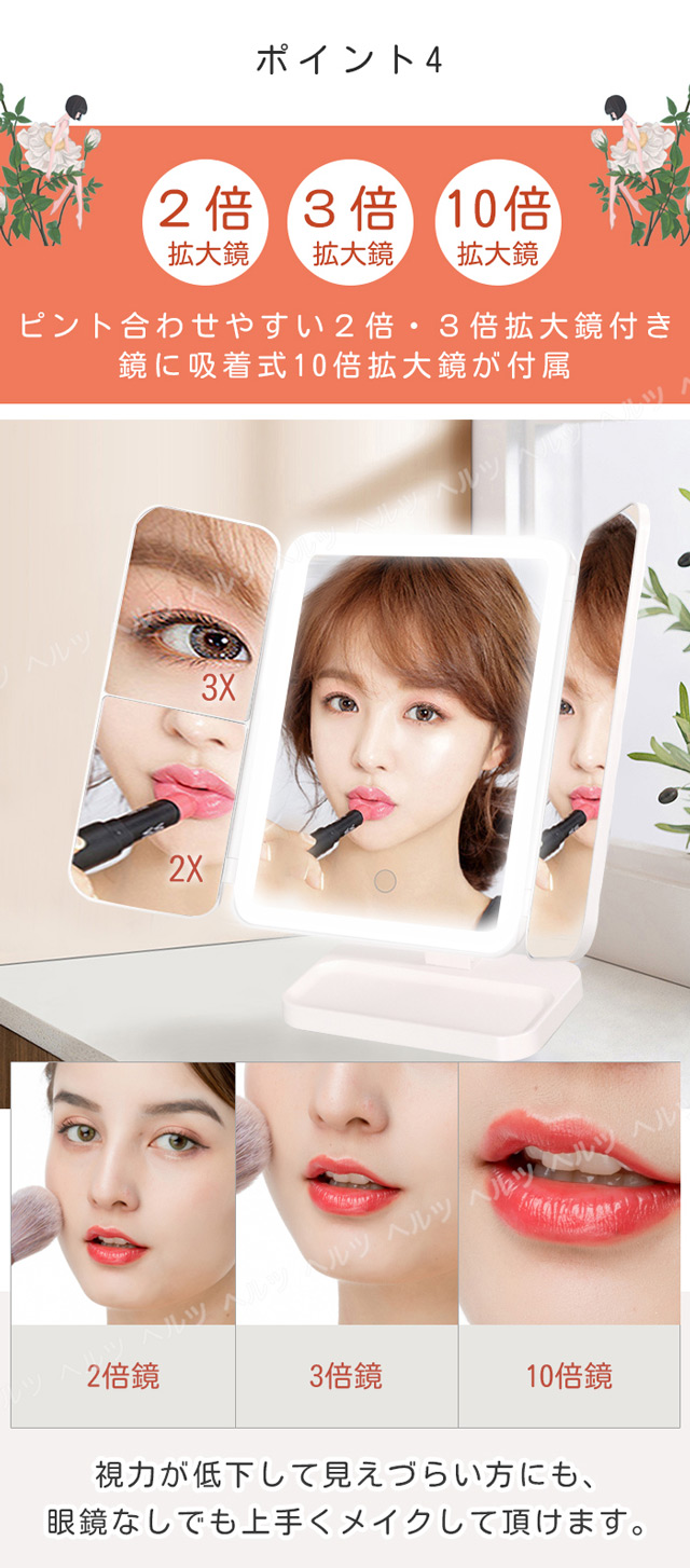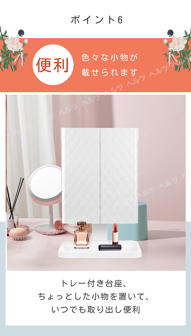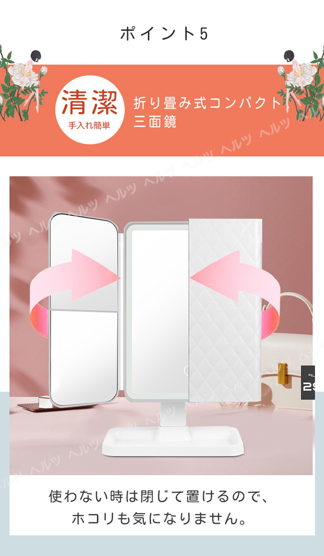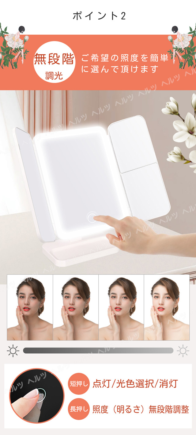 高輝度のLEDライト付きのミラーを使って女優気分でメイクしましょう。そして本当の肌色を映すミラー。よりいっそう美人に!暗いところや薄暗い状況でもメイができます。LEDライト 明るさ調整可能となりますので三面鏡のタッチパネルで明るさ調整できます、とても便利です。