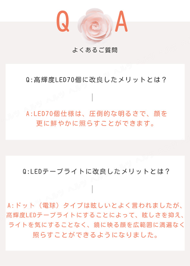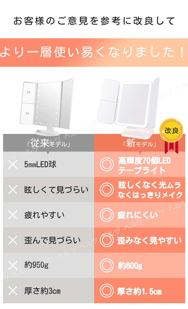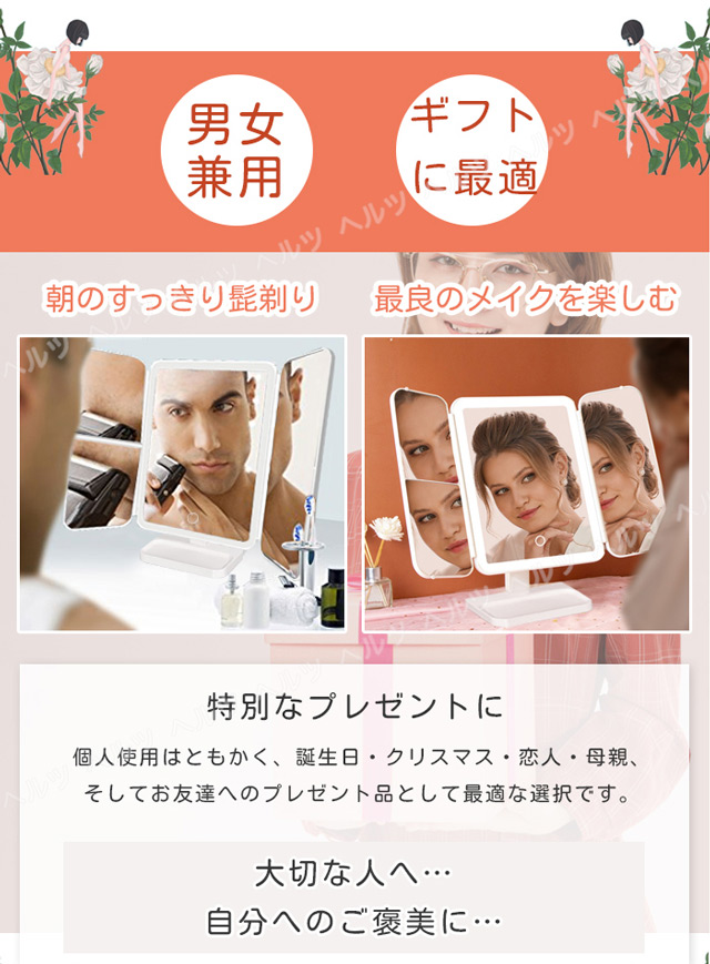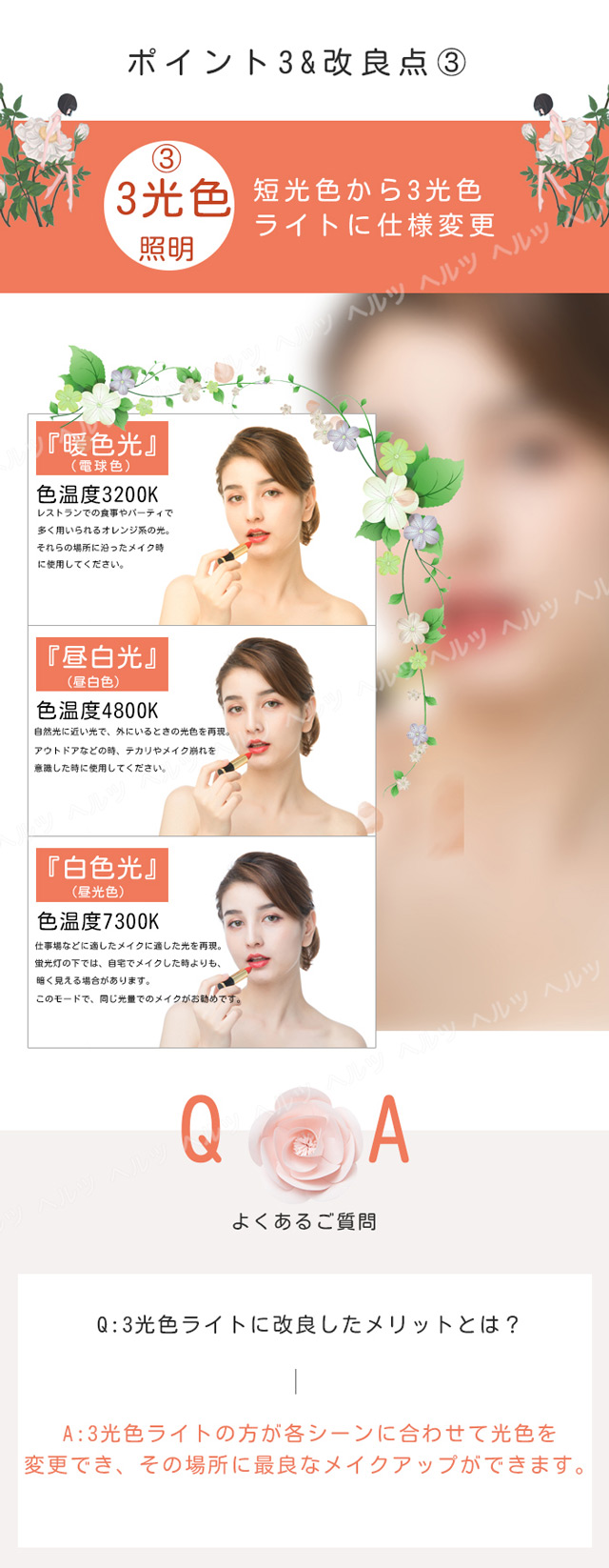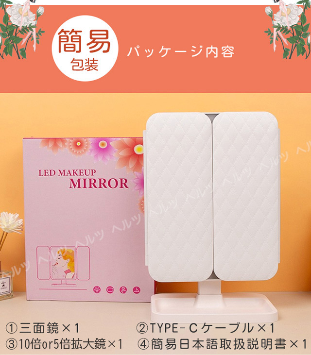 高輝度のLEDライト付きのミラーを使って女優気分でメイクしましょう。そして本当の肌色を映すミラー。よりいっそう美人に!暗いところや薄暗い状況でもメイができます。LEDライト 明るさ調整可能となりますので三面鏡のタッチパネルで明るさ調整できます、とても便利です。