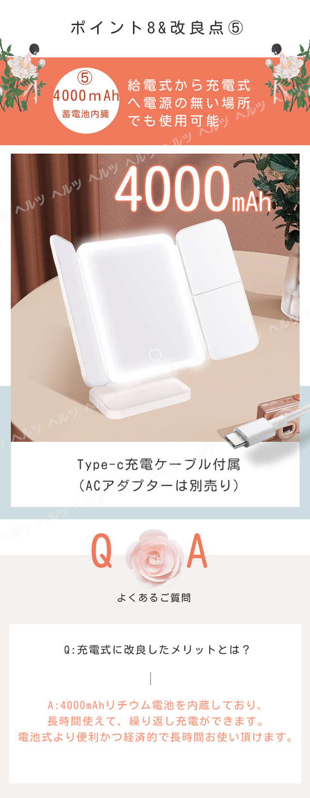 自宅など固定場所には付属したTYPE-C充電ケーブルで電源を接続してLEDライト機能を使用できます。4000mAhのバッテリーを内蔵されてビジネス、イベントなど電源がない場合にはご使用いただけますのでとても便利です。