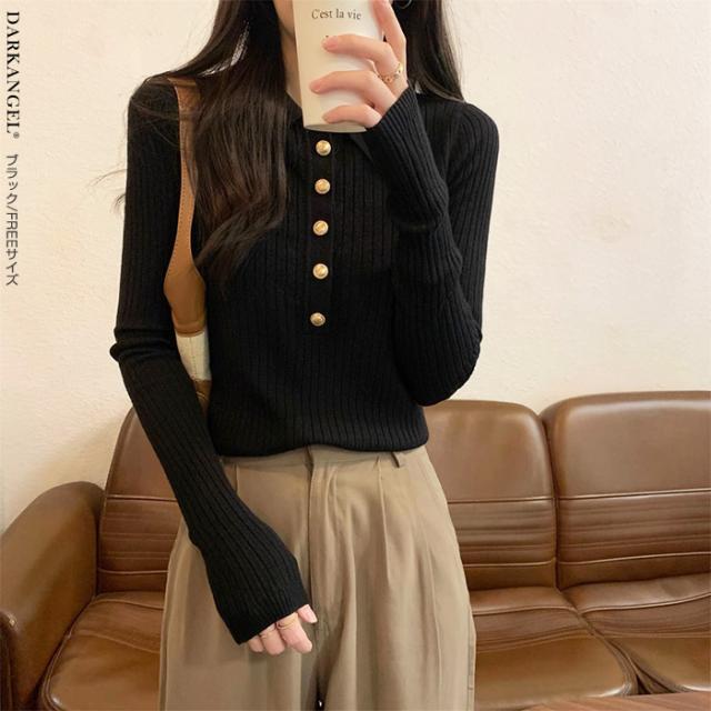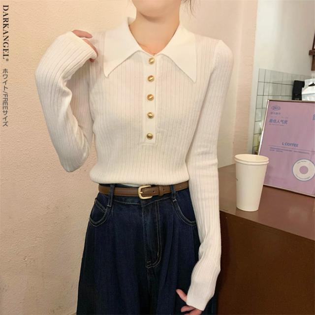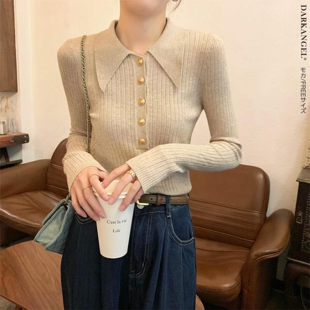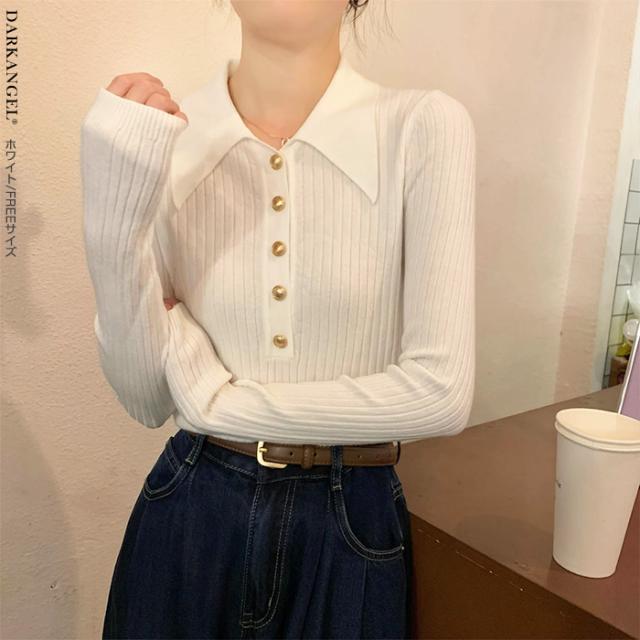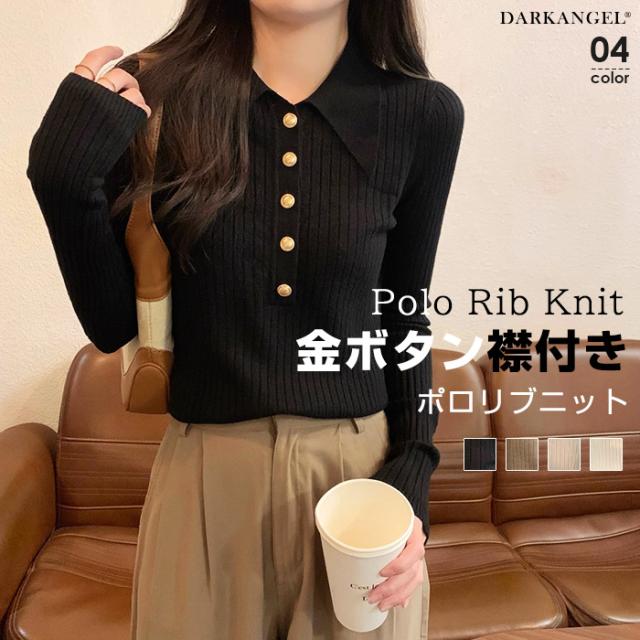 33%OFFクーポン!トップス ニット リブニット セーター 襟付き ボタン レディース 秋 冬 春 vネック リブ 長袖 金ボタン 上品 シンプル カジュアル ブラック【金ボタンポロニット】 ダークエンジェル 春新作 trend_nit ●即納●