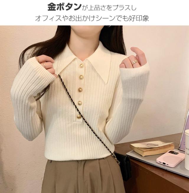 【 金ボタンポロニット 】 柔らかく伸縮性のあるリブ素材が、 体のラインを綺麗に見せてくれます。 ボタンを閉めてきちんと感を演出でき、 ボタンを開けると抜け感を演出できます。 金ボタンがエレガントなアクセントになり、 きちんとした印象をプラス。 |