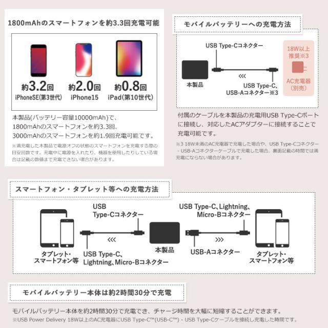 | 充電時間 | 約2時間30分 ※USB Power Delivery 18W以上のAC充電器を使用した場合 |