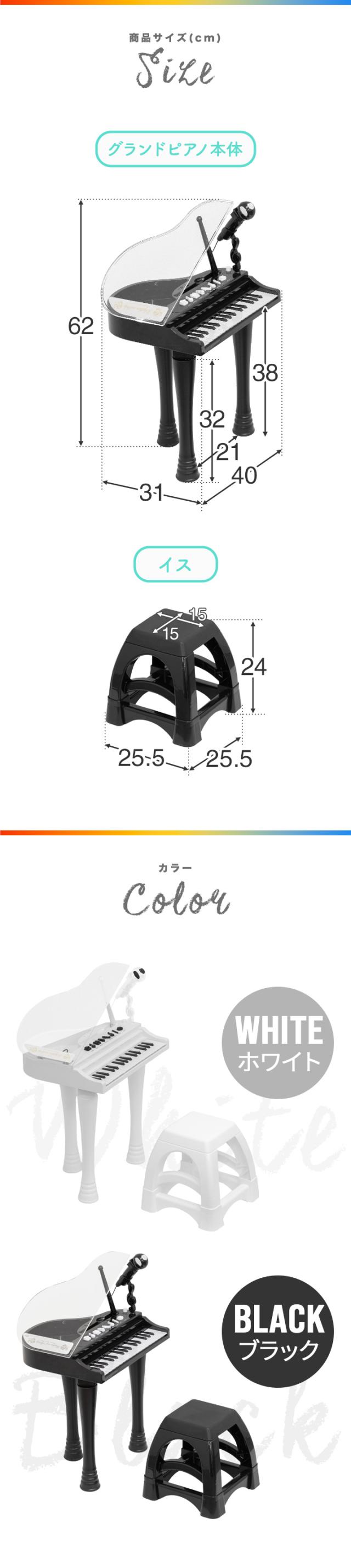 | サイズ: ・ピアノ本体:(約)幅40cm×奥行31cm×高さ62cm ※上記はピアノ本体のサイズ(フタを開けた状態)となります。 ※ピアノのフタを閉めた際の高さは43cmとなります。 ・イス:(約)幅25.5cm×奥行25.5cm×高さ24cm |
