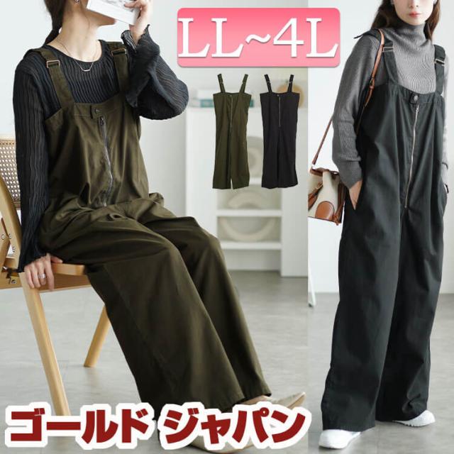 春新作 大きいサイズ レディース オールインワン サロペット フロントジップサロペットパンツ サロペ パンツ ワイドパンツ ロングパンツ サロペットパンツ ロング ワイド ジップ ポケット ギャザー 秋服 冬服 春服 夏服 LL 2L 3L 4L ブラック 黒 カーキ ゴールドジャパン