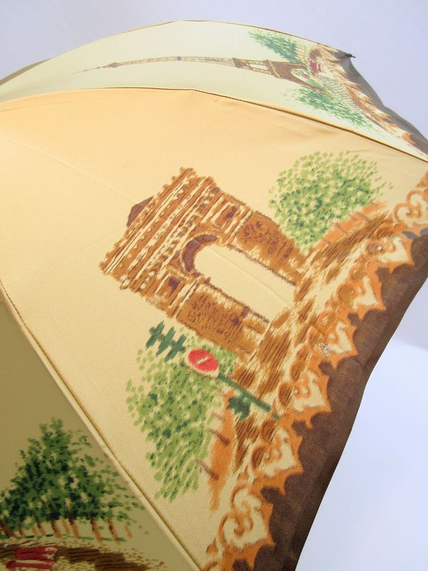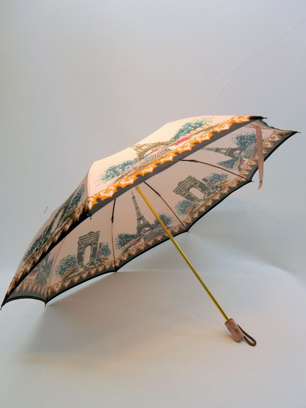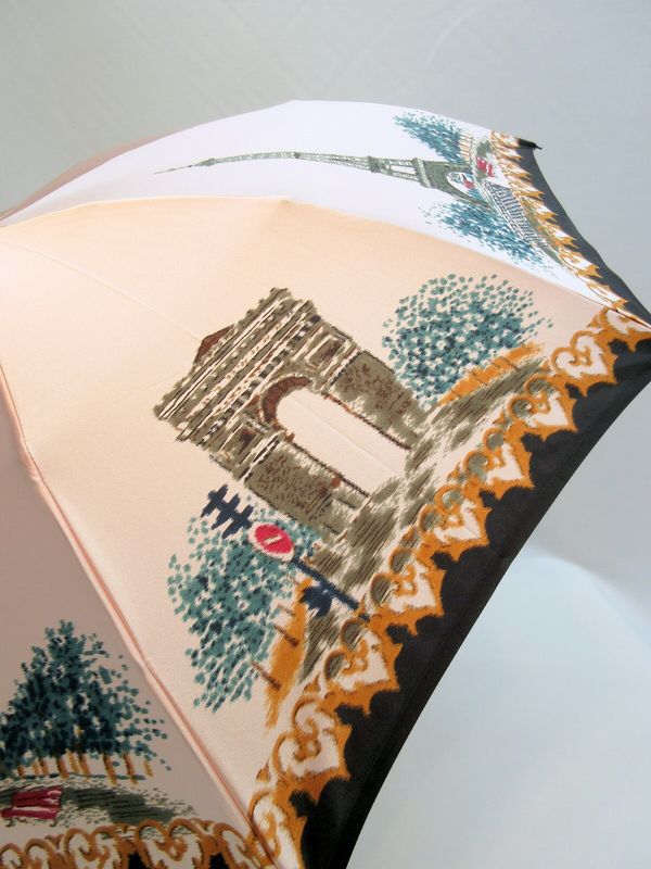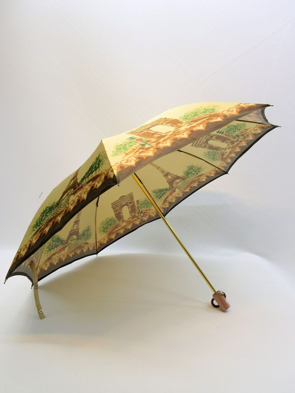 甲州(山梨県)で1反1反手作業で丹念に精魂込めて織り上げた甲州織生地使用の軽量骨の折り畳雨傘です。柄のフチがにじんだようになっているのが特長の特殊伝統技法のホグシ織で凱旋門・エッフェル塔・柄を織り上げ、駒取の手法で2段の軽量骨に張りました。