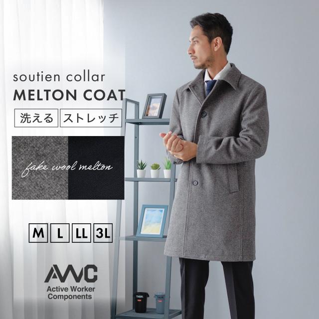 メルトンコート メンズ ビジネス 洗える ストレッチ ハーフコート ビジネスコート 膝上 冬 防寒 暖かい おしゃれ きれいめ AWC ブランド 通勤 ウールライク 20代 30代 40代 50代 ウォッシャブル M L LL 3L