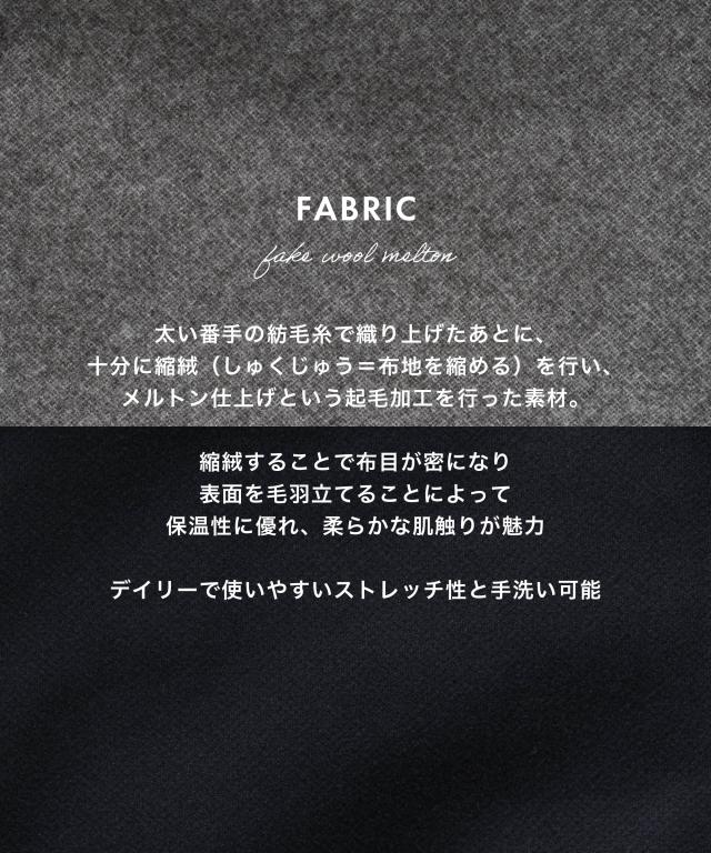 太い番手の紡毛糸で織り上げた後に、十分に縮絨(しゅくじゅう=布地を縮める)を行い、メルトン仕上げという起毛加工を行なった素材