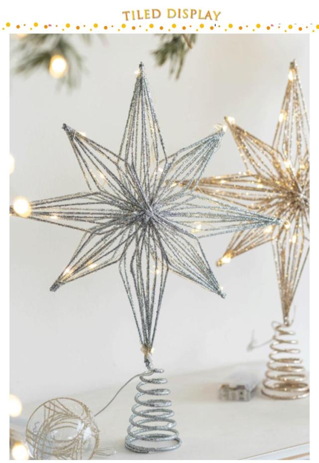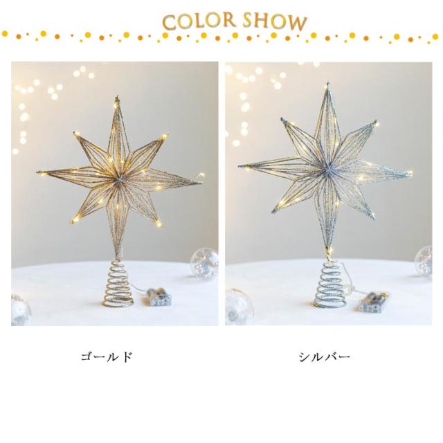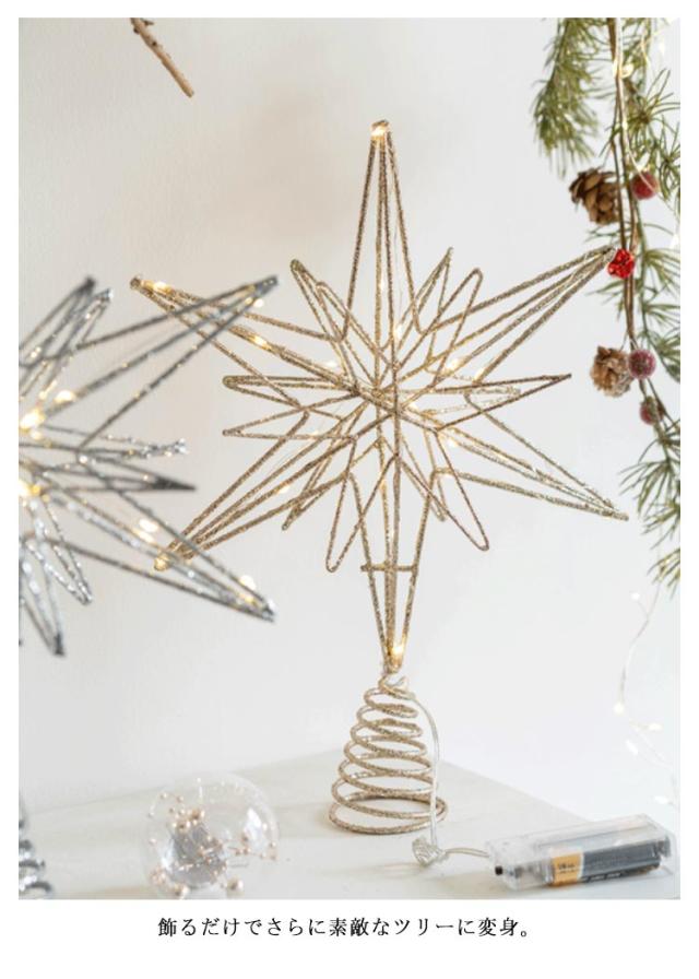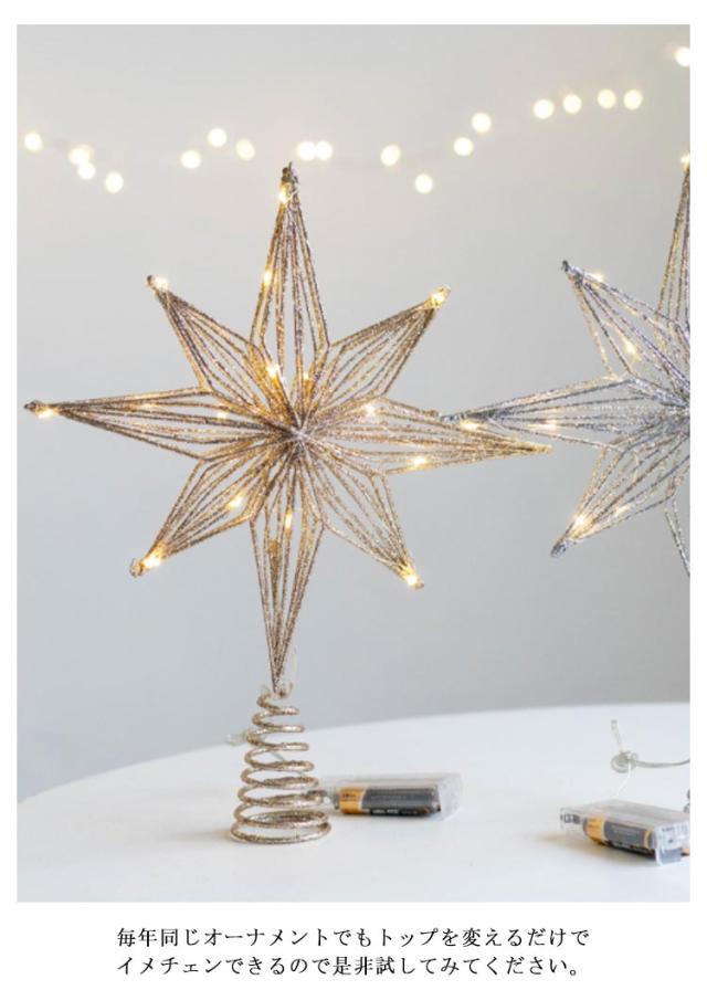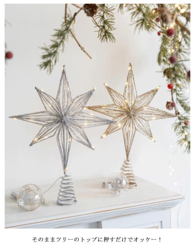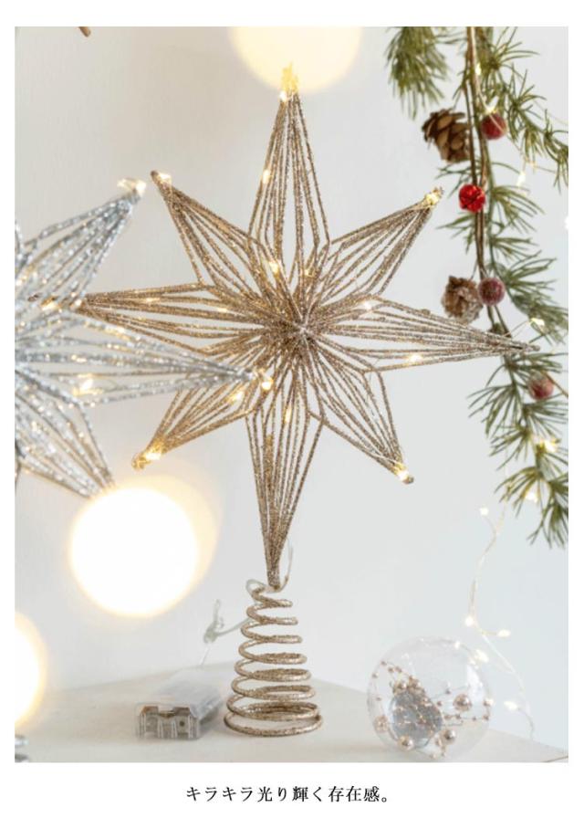 | キラキラの八角星のトップスター。LEDライト付き。【電池式】 そのままツリーのトップに押すだけでオッケー! キラキラ光り輝く存在感。 空間に溶け込みやすいナチュラルカラーのライト付きバージョンもあります。 飾るだけでさらに素敵なツリーに変身。 毎年同じオーナメントでもトップを変えるだけでイメチェンできるので是非試してみてください。 電池式のLEDライトは充電の必要がなく、2本の単3電池を入れ点灯させると綺麗に輝きます。 本商品はグリッター(金粉)を使用していますので、多少剥離いたします。あらかじめご了承願います。 | |