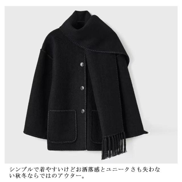 マフラー付き ショート丈 厚手 レディース ショートコート ハーフコート マフラー付き ジャケット ラシャコート コート 軽量 フェイクウール 柔らか ぽわん袖 ポケット付き 体型カバー 防寒 大人かわいい