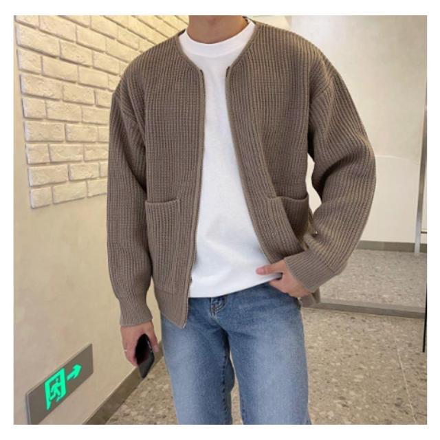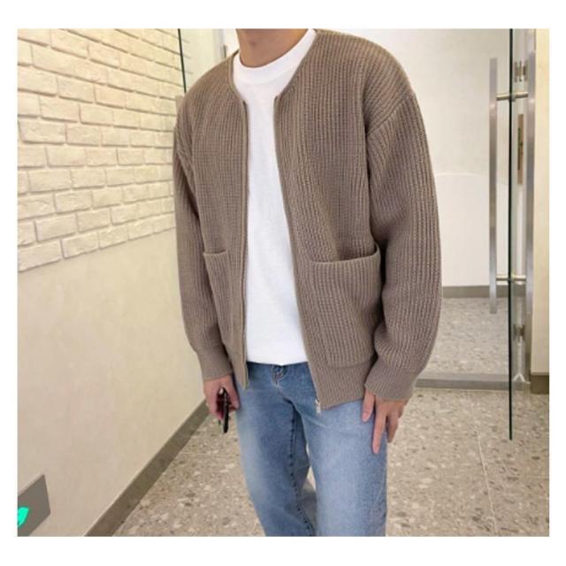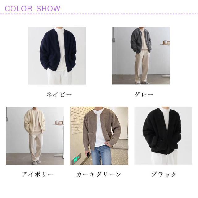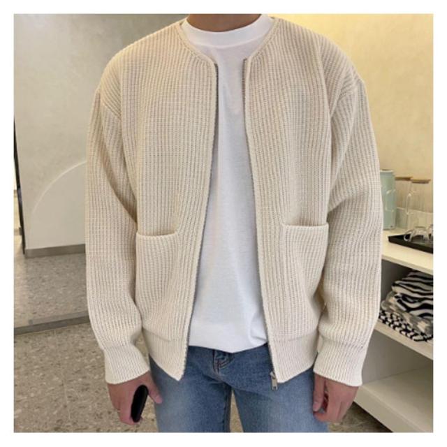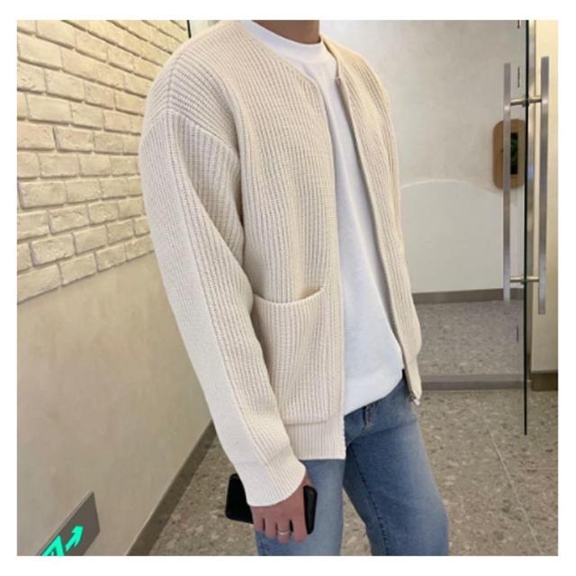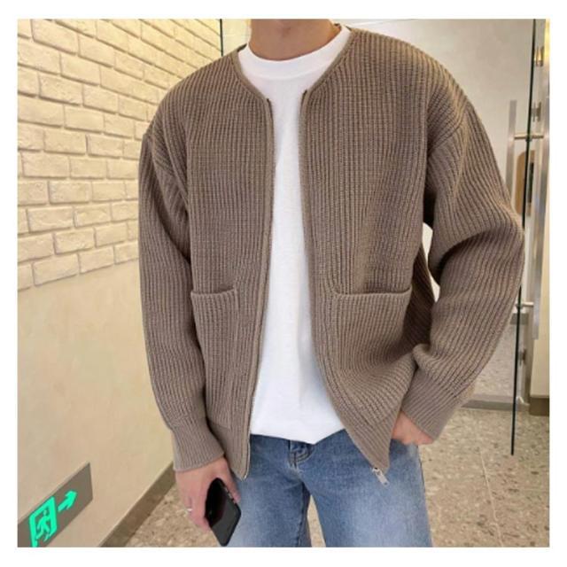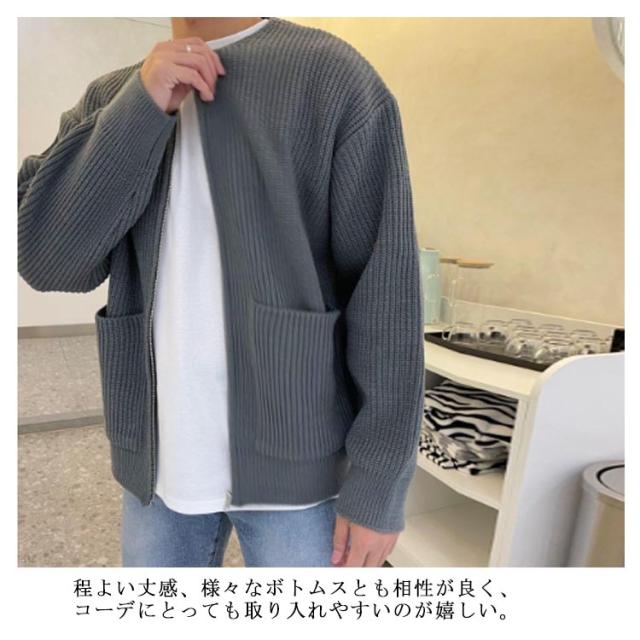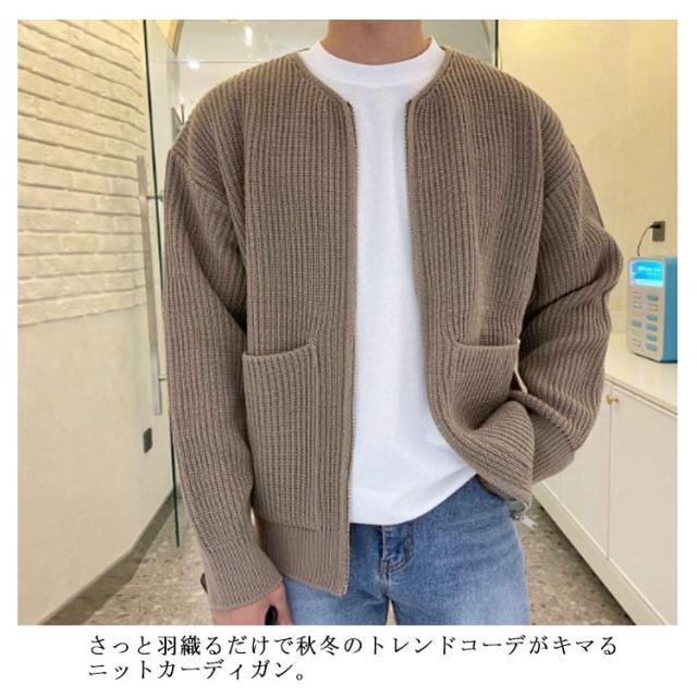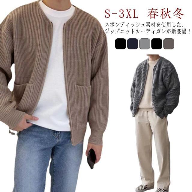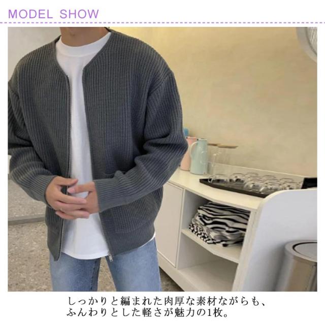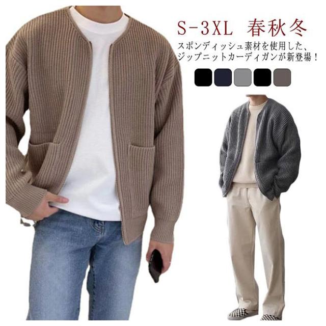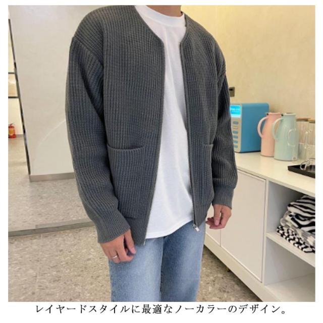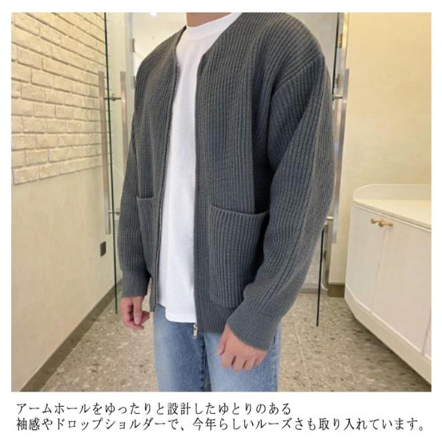 メンズ カーディガン ノーカラー 冬 ニットジャケット ジップアップ ボリューム ジャケット ニット トップス 春 秋 ゴルフニット セーター 羽織り アウター ゴルフニット ファスナー ポケット カジュアル きれいめ ドロップショルダー 体型カバー ゆったり
