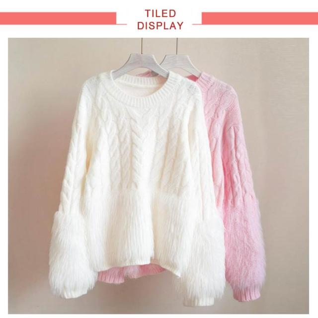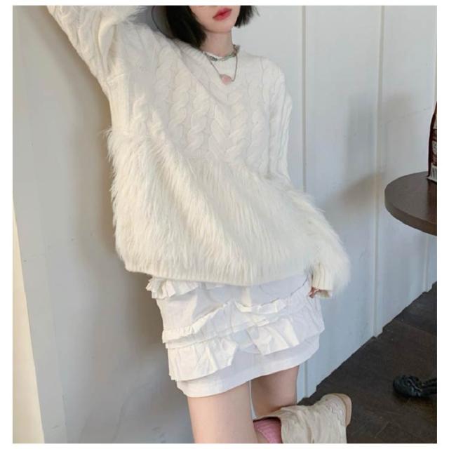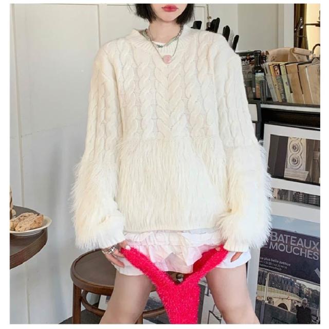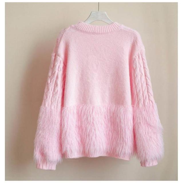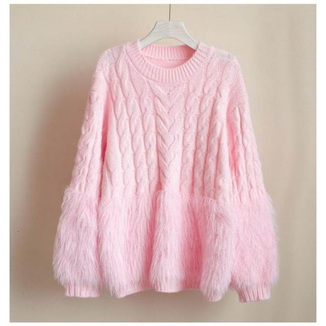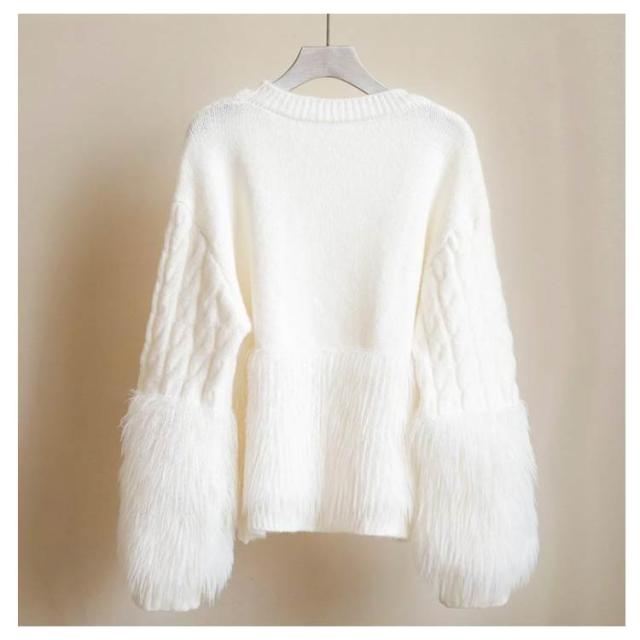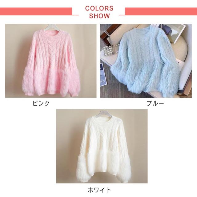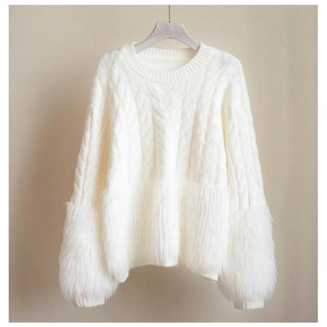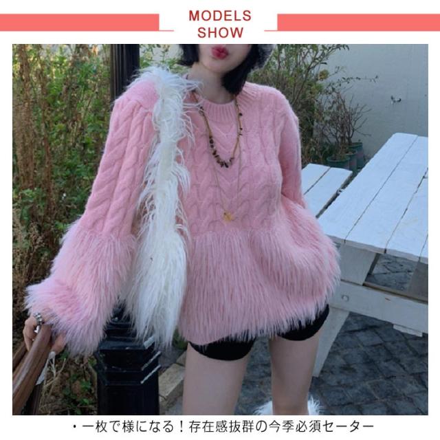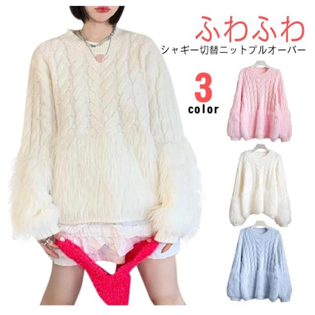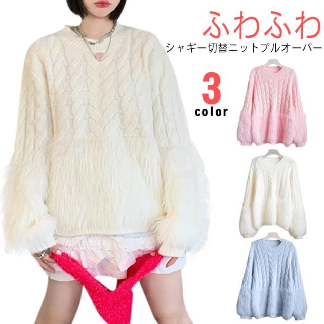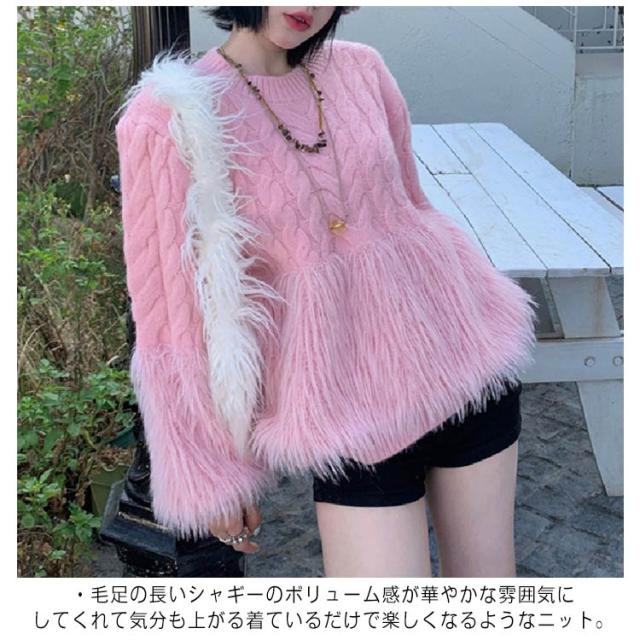 ケーブルニット シャギーニット セーター レディース 丸首 シャギー切替ニット トップス ニット クルーネック ニットプルオーバー おしゃれ きれいめ ボリューム 厚手 異素材 切り替え 上品 特別 カジュアル