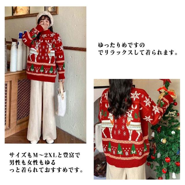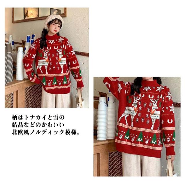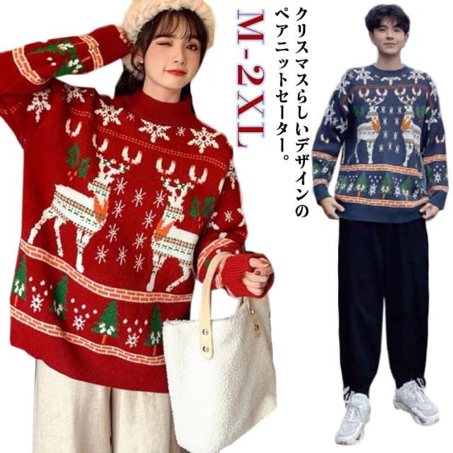 クリスマス セーター ペアルック メンズ レディース ニット セーター ニット プルオーバー ノルディック柄 セーター クルーネック 長袖 厚手 暖かい トップス 秋冬 雪柄 サンタ服 可愛い おしゃれ 大きめ ゆったり カップル お揃い 送料無料 赤