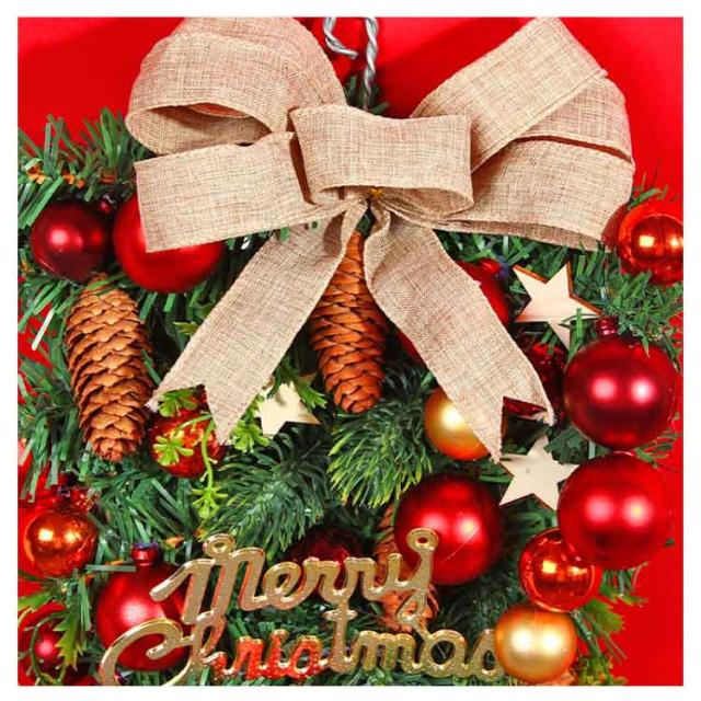 | ナチュラル素材を使用したリース。 赤を基調とした、リボンがアクセントの華やかなデザイン◎ あたたかみのあるリアル松ぼっくりを使用。 壁面へ掛けたり、棚の上に立てかけたりとさまざまな飾り方が選べるのも魅力。 クリスマスらしい特別な雰囲気を演出してくれるので、パーティの飾りつけや、お部屋にシーズンムードを取り入れたい時にもおすすめですよ。 ひとつ飾るだけで、クリスマスの雰囲気を演出できます。 | |