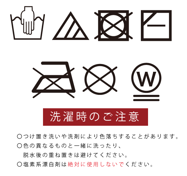 | お取り扱い方法 | ![]() 洗濯時のご注意 ・使用素材は、柔らかさ、温かさに優れている反面、毛玉ができやすい特徴があります。 ・お手入れには、毛玉取り器をご使用ください。 ・塩素系漂白剤は使用しないでください。 ・洗濯の際は、ネットをご使用ください。 ・タンブラー乾燥はお避け下さい。 ・濃色製品は、単独洗いをしてください。 |