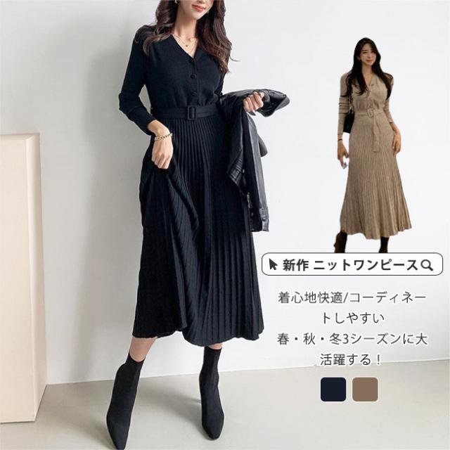 ニットワンピース レディース秋冬きれいめ 上品ワンピース プリーツ模様 ウエストマーク ベルト付き ハイウエスト Aライン Vネック ニット ミモレ丈 着痩せセーターワンピース