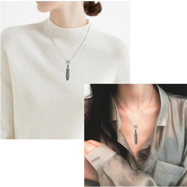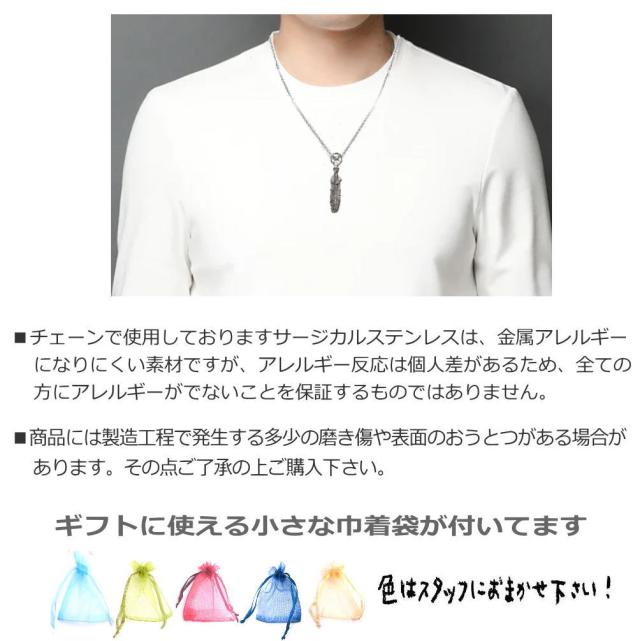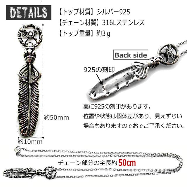 程よいサイズ感の軽やかなフェザーモチーフ。シルバー925製トップです。デザインにマッチした、長さ50cmのステンレス製のチェーンが付いているので、すぐご使用いただけます。燻し加工によるくっきりとした陰影があり、アンティークな風合いが漂います。
